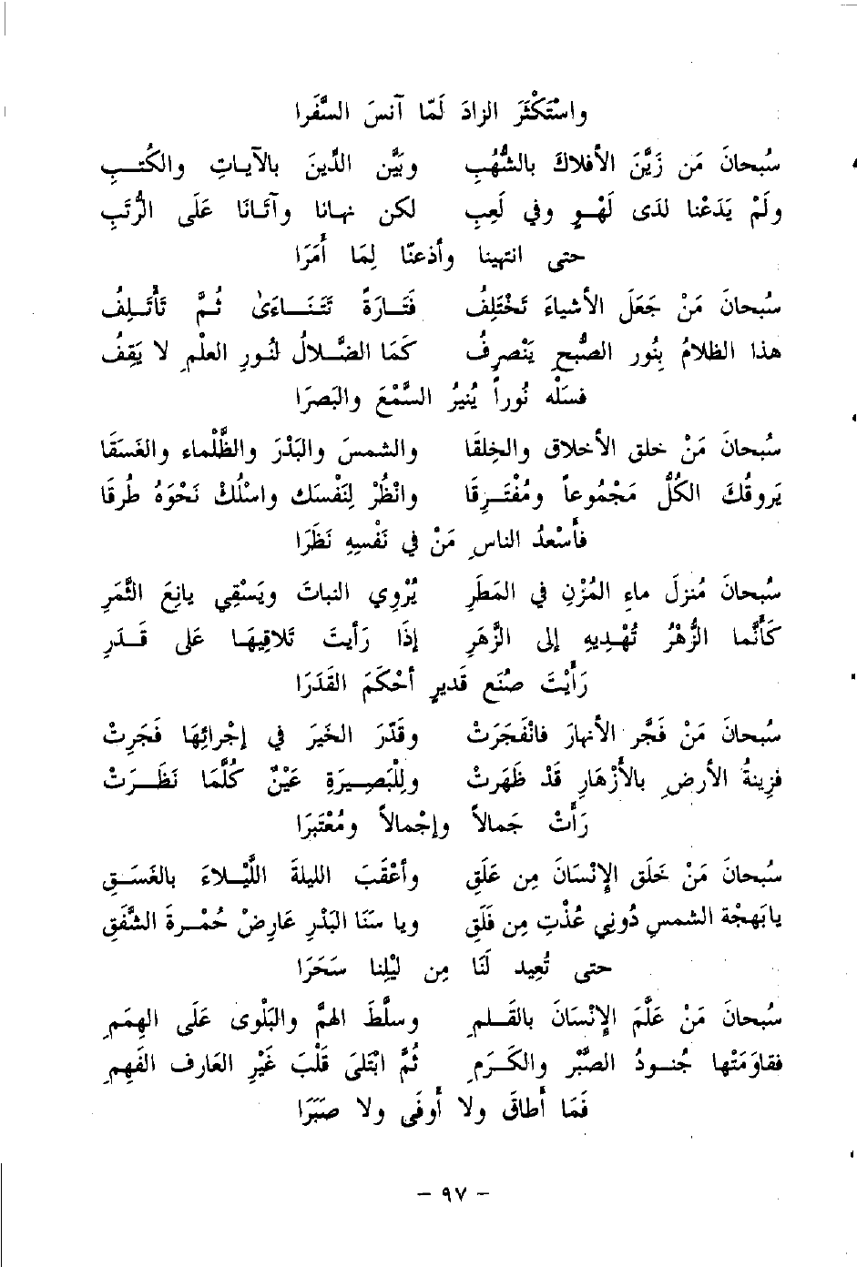 سُبحانَ مَنْ خَلَق الإِنْسَانَ مِن عَلَقِ ... وأعْقَبَ الليلةَ اللَّيْلاءَ بالغَسَقِ