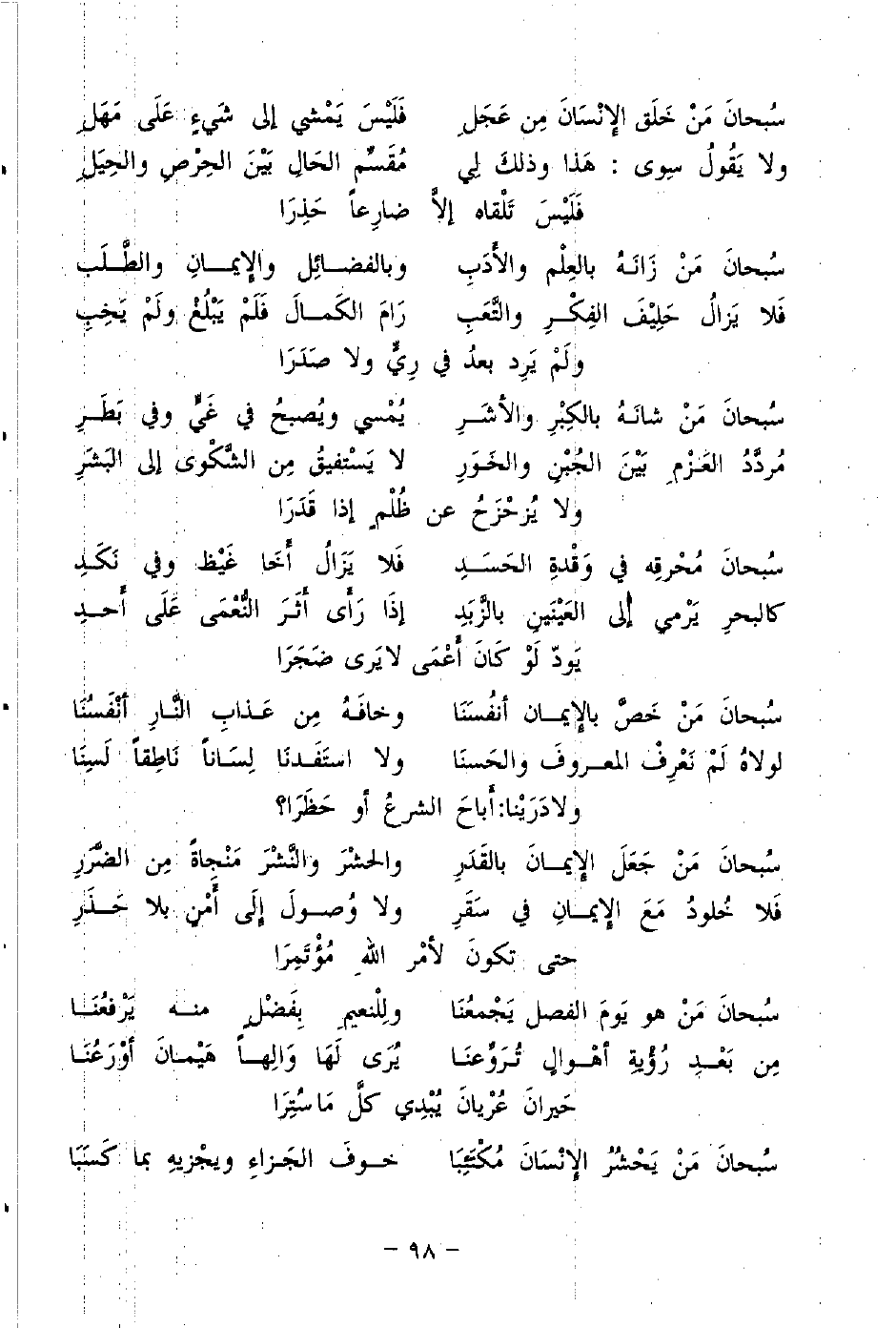 سُبحانَ مَنْ خَلَق الإِنْسَانَ مِن عَجَلِ ... فَلَيْسَ يَمْشي إلى شَيءٍ عَلَى مَهَلِ