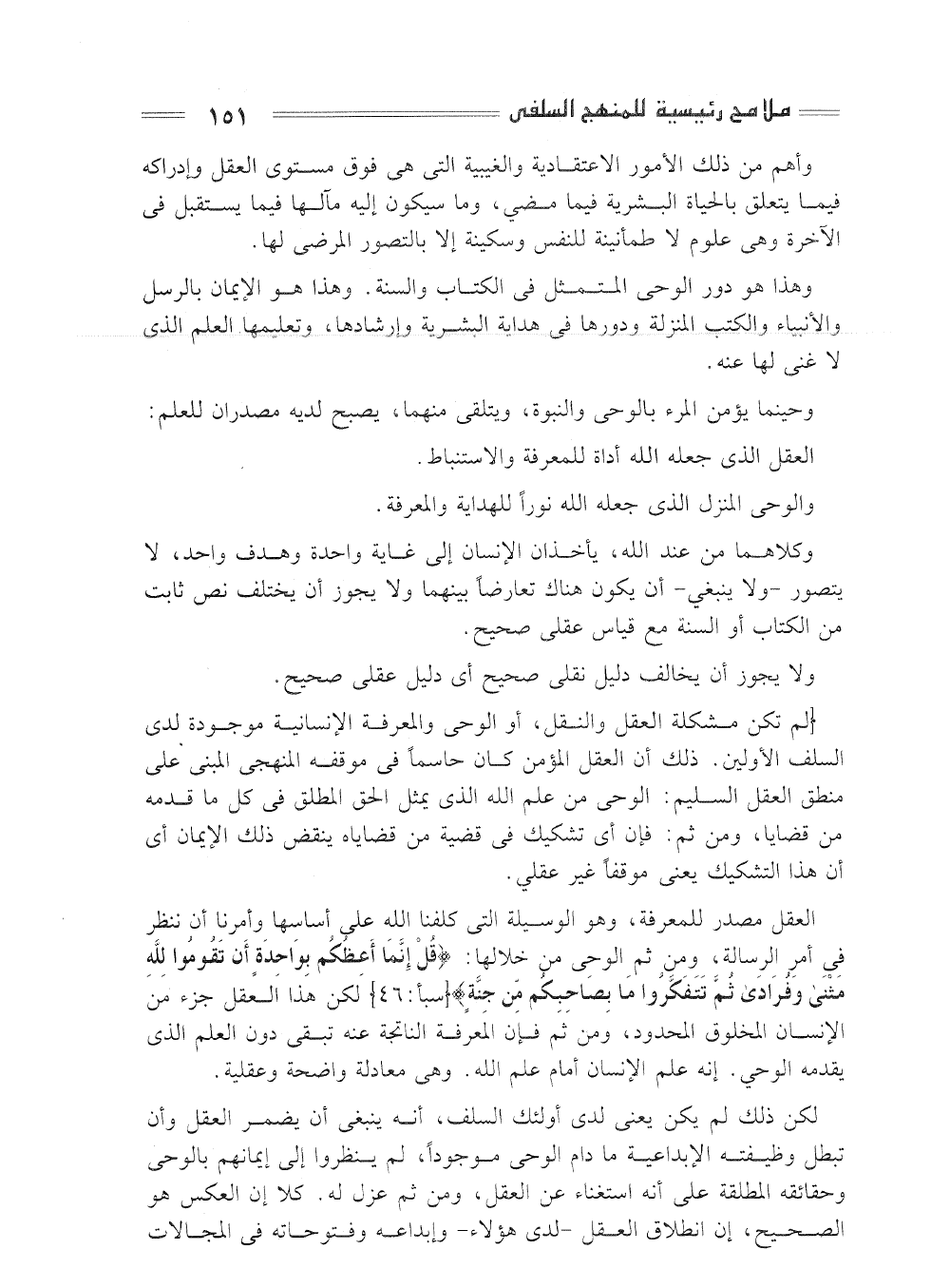 "لم تكن مشكلة العقل والنقل - أو الوحي والمعرفة الإنسانية - موجودة لدى السلف الأولين. ذلك أن العقل المؤمن كان حاسماً في موقفه المنهجي المبني على منطق العقل السليم: الوحي من علم الله الذي يمثل الحق المطلق في كل ما قدمه من قضايا، ومن ثم: فإن أي تشكيك في قضية من قضاياه ينقض ذلك الإيمان، أي أن هذا التشكيك يعني موقفاً غير عقلي.