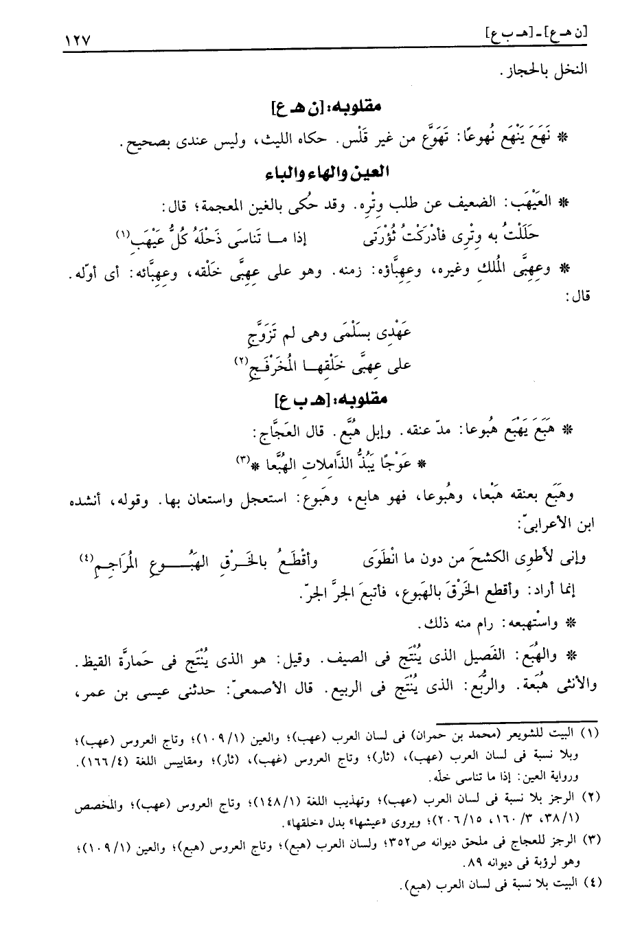 العِهْن: الصُّوف الْمَصْبُوغ ألوانا. وَقيل: الْمَصْبُوغ أَي لون كَانَ. وَقيل: كل صوف عِهن. والقطعة مِنْهُ عِهْنة. والجميع: عُهُون.