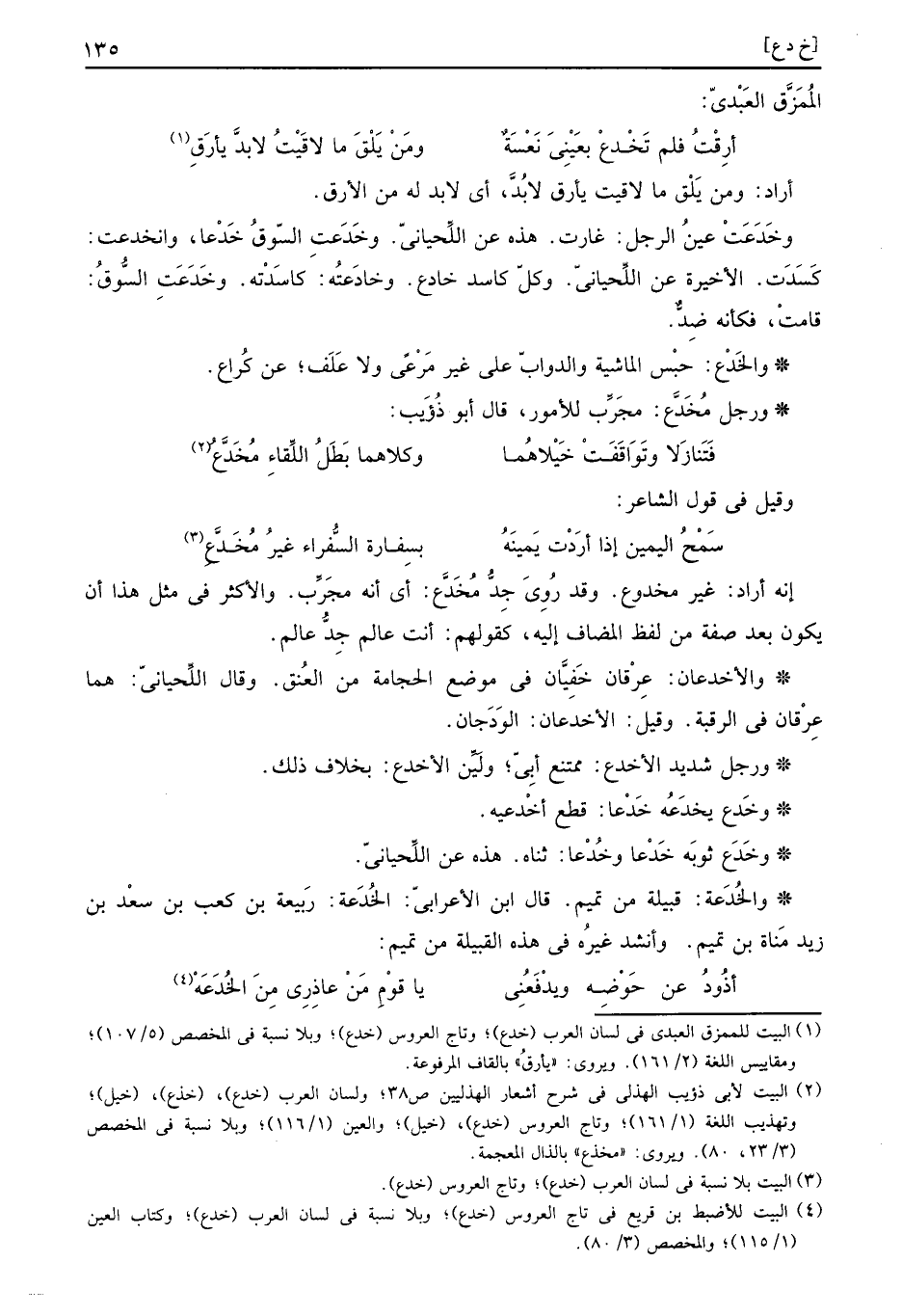 والخَيْدَع: الَّذِي لَا يوثق بمودته. والخَيدع: السراب، لذَلِك. وغول خَيْدع مِنْهُ. وَطَرِيق خَيدَع، وخادع: جَائِر، مُخَالف للقصد، لَا يفْطن بِهِ، قَالَ الطرماح: