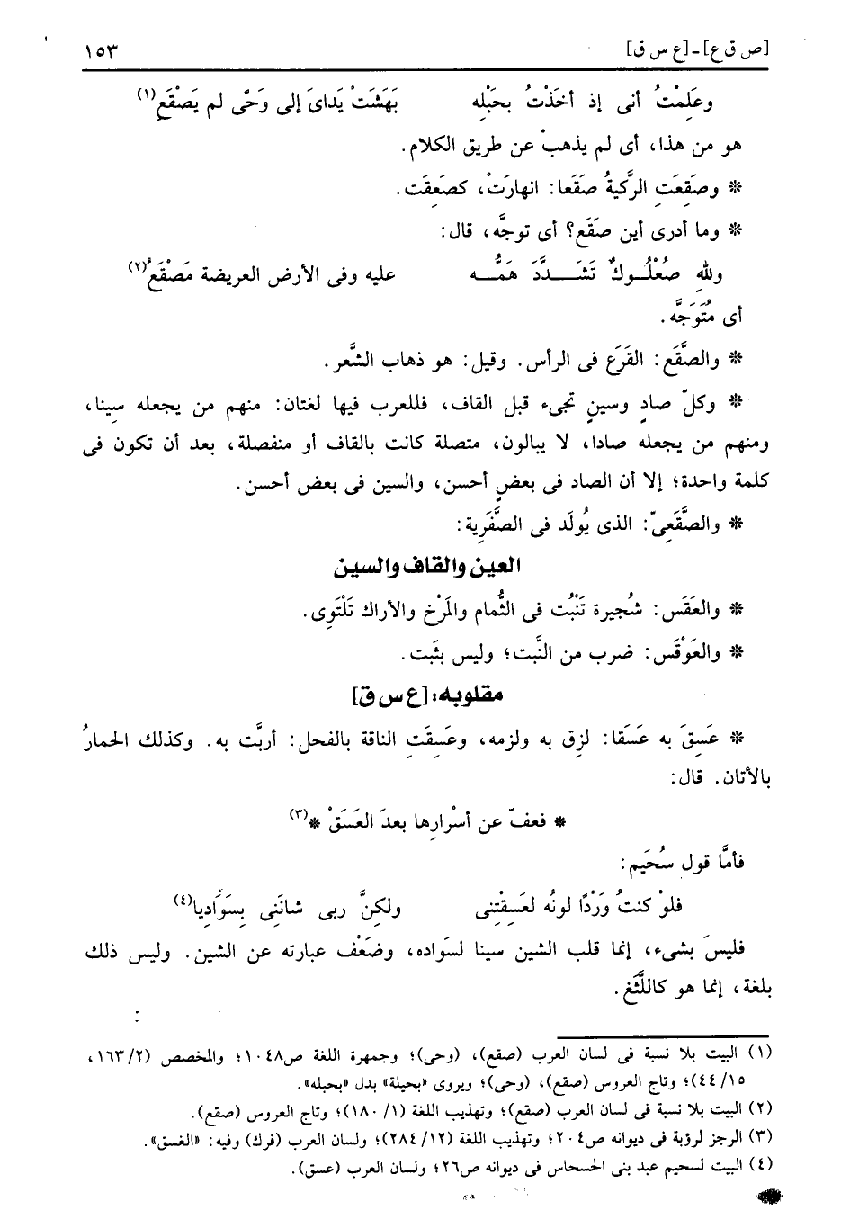 وصَقَع الثَّرِيد يصقَعه صَقْعا: أكله من صَوْقَعَتِه. وصنع رجل لأعرابي ثريدة ياكلها، ثمَّ قَالَ: لَا تَصْقَعْها، وَلَا تشرمها، وَلَا تقعرها. قَالَ فَمن أَيْن آكل؟ لَا ابا لَك. تشرمها: تخرقها وتقعرها: تَأْكُل من اسفلها.