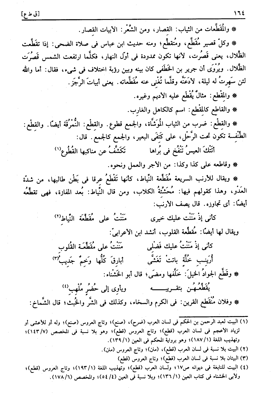 وقَطَعَ رَحِمَه قَطْعا، وقَطَّعها: عَقَّها. وَقَوله تَعَالَى: (أنْ تُفْسِدوا فِي الأَرْض، وتُقَطِّعوا أرْحامَكُمْ) : أَي تعودوا إِلَى أَمر الْجَاهِلِيَّة، فتفسدوا فِي الأَرْض، وتئدوا الْبَنَات. وَقيل: " تقطعوا ارحامكم: تقتل قُرَيْش بني هَاشم، وَبَنُو هَاشم قُريْشًا ".