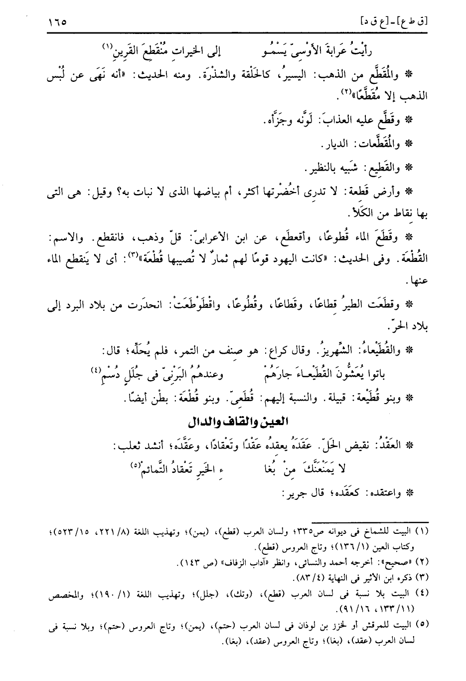 والقَطيع: الطَّائِفَة من الْغنم وَالنعَم وَنَحْوه، وَالْغَالِب عَلَيْهِ انه من عشرٍ إِلَى أَرْبَعِينَ. وَقيل مَا بَين خمس عشرَة إِلَى خمس وَعشْرين. وَالْجمع: أقْطاع، وأَقطِعة، وقُطْعان، وقِطاع، وأقاطيع، قَالَ سِيبَوَيْهٍ. وَهُوَ مِمَّا جمع على غير بِنَاء واحده. وَنَظِيره عِنْده: حَدِيث وَأَحَادِيث. والقطعة كالقطيع. والقطيع: السَّوْط يقطع من جلد سير، وَيعْمل مِنْهُ. وَقيل: هُوَ مُشْتَقّ من القطيع الَّذِي هُوَ الْمَقْطُوع من الشّجر. وَقيل: هُوَ الْمُنْقَطع الطّرف. وَعم أَبُو عبيد بالقطيع. وَحكى الْفَارِسِي: قطعتُه بالقَطيع: أَي ضَربته بِهِ. كَمَا قَالُوا: سطته بِالسَّوْطِ.