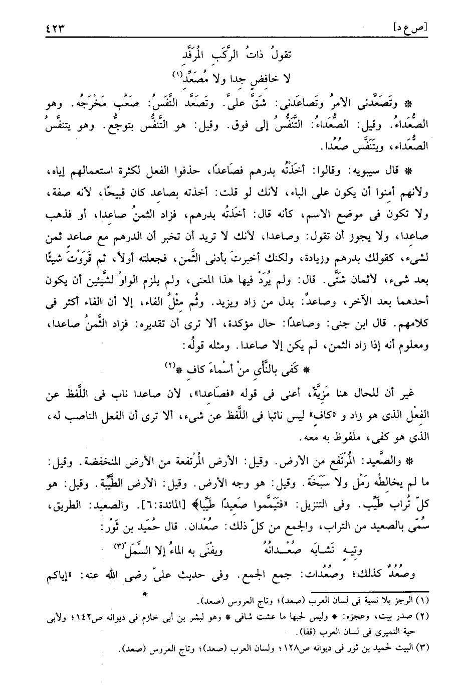 صَعِد الْمَكَان وَفِيه صُعودا، وأصعد، وصَعَّد: ارْتقى مشرفا، واستعاره بعض الشُّعَرَاء للعرض الَّذِي هُوَ الْهوى، فَقَالَ: