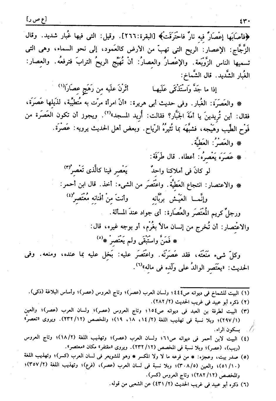 وَقيل العَصْران: الْغَدَاة والعشي. يُقَال: لَا أفعل ذَلِك مَا اخْتلف العَصْران. والعَصْر: الْعشي إِلَى احمرار الشَّمْس. وَصَلَاة العَصْر: مُضَافَة إِلَى ذَلِك الْوَقْت. قَالَ: