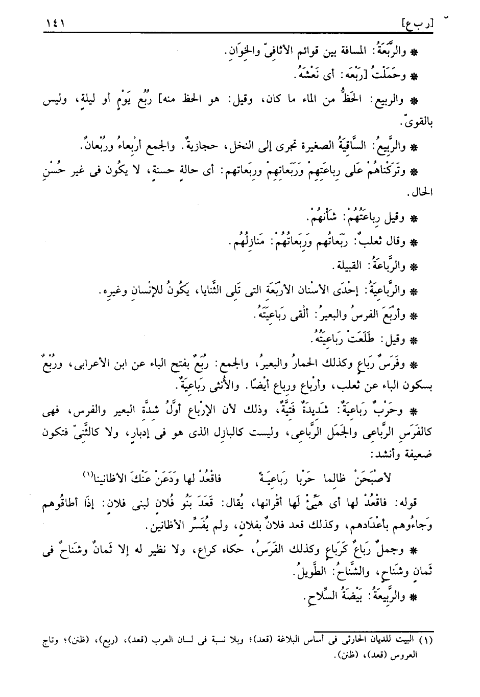 وَفرس رَباعٍ وَكَذَلِكَ الْحمار وَالْبَعِير، وَالْجمع: رُبَعٌ بِفَتْح الْبَاء عَن ابْن الْأَعرَابِي، ورُبْعٌ بِسُكُون الْبَاء عَن ثَعْلَب، وأرْباع ورِباع أَيْضا. وَالْأُنْثَى رَباعِيَةٌ وَحرب رَباعِيَةٌ: شَدِيدَة فتية، وَذَلِكَ لِأَن الإرْباع أوَّل شدَّة الْبَعِير وَالْفرس، فَهِيَ كالفرس الرَّباعي والجمل الرَّباعي، وَلَيْسَت كالبازل الَّذِي هُوَ فِي إدبار، وَلَا كالثني فَتكون ضَعِيفَة وَأنْشد: