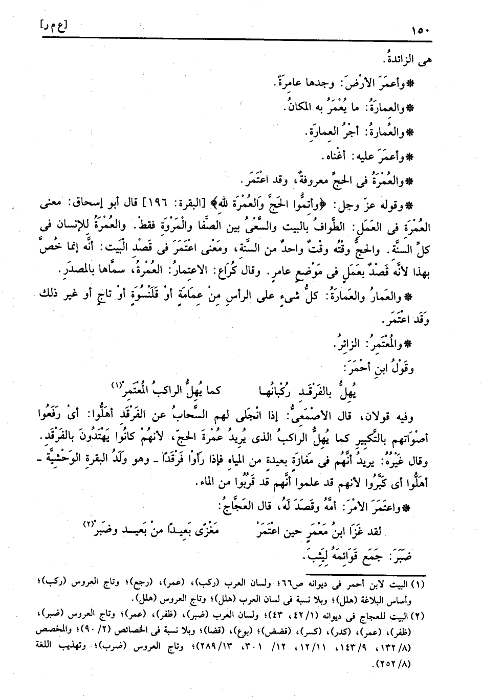 والعُمْرَةُ فِي الْحَج مَعْرُوفَة، وَقد اعْتَمَر، وَقَوله عز وَجل: (وأتِمُّوا الحَجَّ والعُمْرَة للهِ) قَالَ أَبُو إِسْحَاق: معنى العُمْرَةِ فِي الْعَمَل: الطّواف بِالْبَيْتِ وَالسَّعْي بالصفا والمروة فَقَط. والعُمْرَةُ للْإنْسَان فِي كل السّنة. وَالْحج وقته وَقت وَاحِد من السّنة، وَمعنى اعْتَمَرَ فِي قصد الْبَيْت: انه إِنَّمَا خص بِهَذَا لِأَنَّهُ قصد بِعَمَل فِي مَوضِع عَامر. وَقَالَ كرَاع: الاعتِمارُ: العُمْرةُ، سَمَّاهَا بِالْمَصْدَرِ.