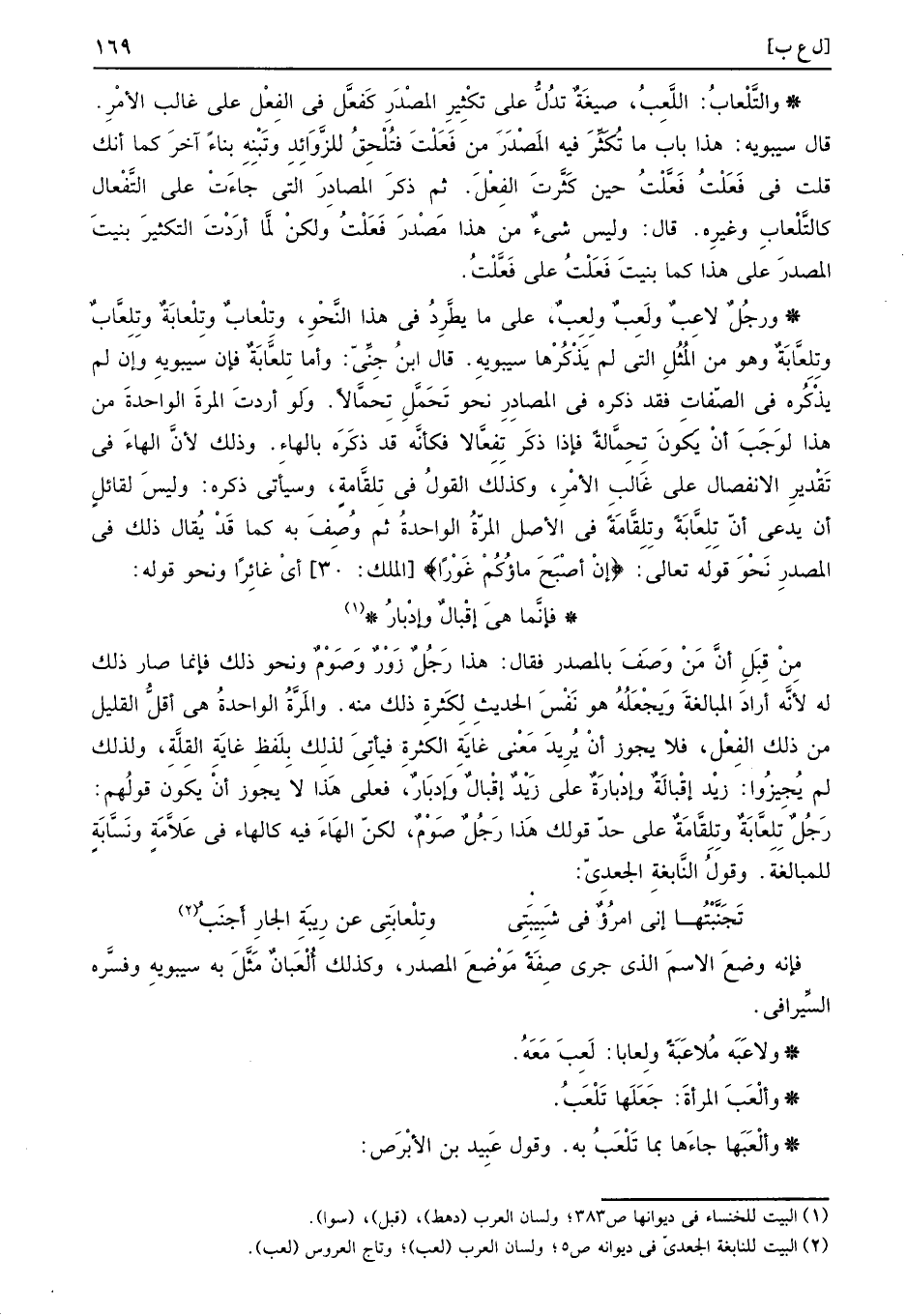 فَإِنَّهُ وضع الِاسْم الَّذِي جرى صفة مَوضِع الْمصدر، وَكَذَلِكَ أُلْعَبانٌ مثَّل بِهِ سِيبَوَيْهٍ وَفَسرهُ السيرافي.