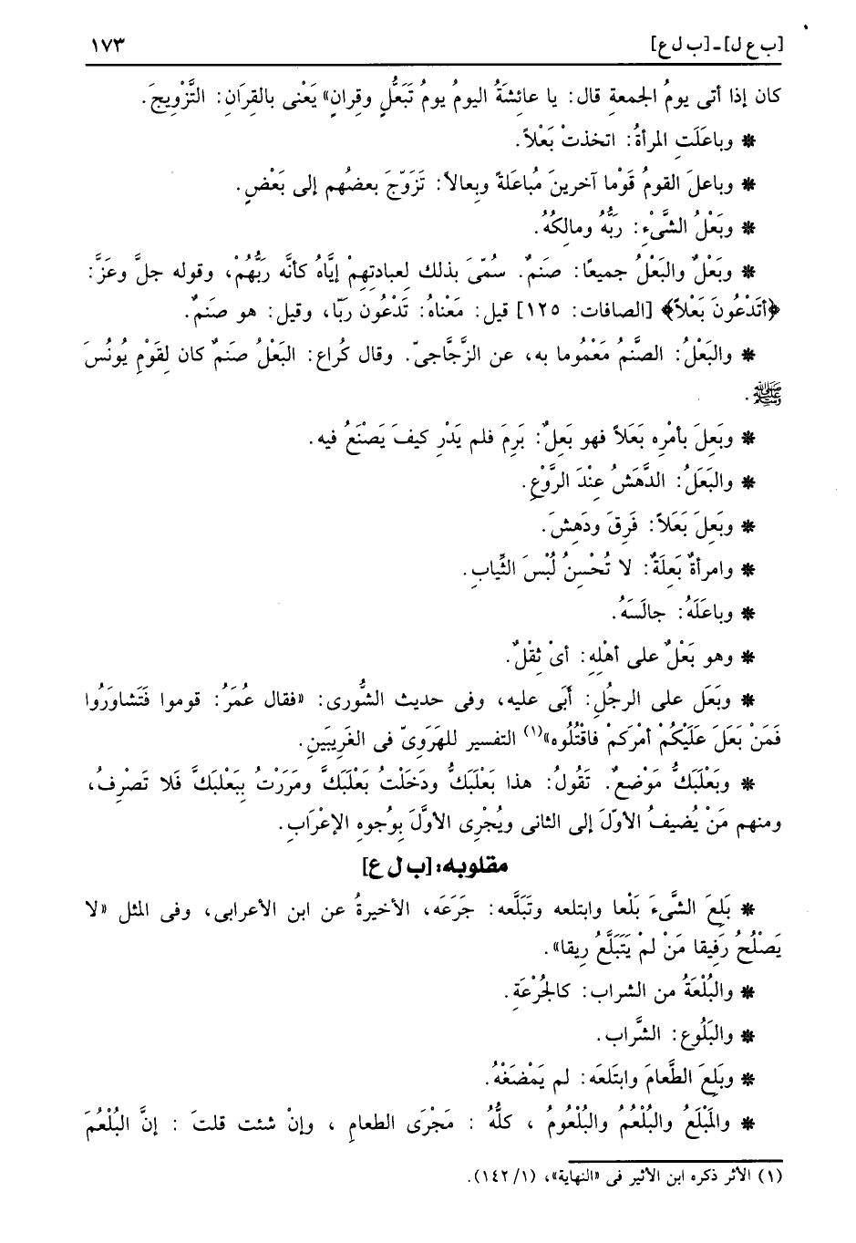 وبَعَل على الرجل: أَبى عَلَيْهِ، وَفِي حَدِيث الشورى: " فَقَالَ عمر: قومُوا فتشاوروا فَمن بَعَلَ عَلَيْكُم أَمركُم فَاقْتُلُوهُ " التَّفْسِير للهروي فِي الغريبين.