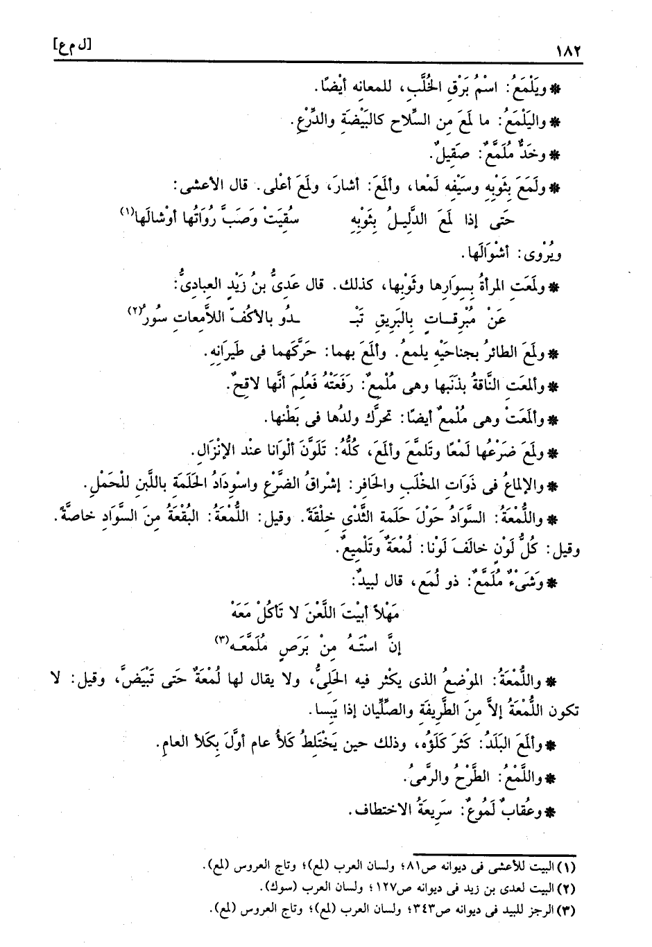وَشَيْء مُلَمَّعٌ: ذُو لُمَع، قَالَ لبيد:
