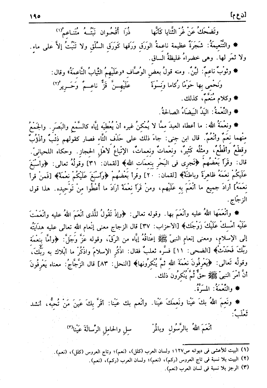 وأنْعَمَها الله عَلَيْهِ وأنْعَمَ بهَا. وَقَوله تَعَالَى: (وإذْ تَقُولُ للَّذي أنْعَمَ اللهُ عَلَيْهِ وأنْعَمْتَ عَلَيْه أمْسِكْ عَلَيْكَ زَوْجَك) قَالَ الزّجاج معنى إنْعام الله تَعَالَى عَلَيْهِ هدايته إِلَى الْإِسْلَام، وَمعنى إنعامِ النَّبِي صَلَّى اللهُ عَلَيْهِ وَسَلَّمَ إِعْتَاقه إِيَّاه من الرّقّ، وَقَوله عز وَجل: (وأمَّا بِنِعْمَةِ رَبِّكَ فَحَدّثْ) فسره ثَعْلَب فَقَالَ: اذكر الْإِسْلَام وَاذْكُر مَا أبلاك بِهِ رَبك، وَقَوله تَعَالَى (يَعْرِفُونَ نِعْمَةَ اللهِ ثمَّ يُنْكِرُونها) قَالَ الزّجاج: مَعْنَاهُ يعْرفُونَ أَن أَمر النَّبِي صَلَّى اللهُ عَلَيْهِ وَسَلَّمَ حق ثمَّ يُنكرُونَ ذَلِك.