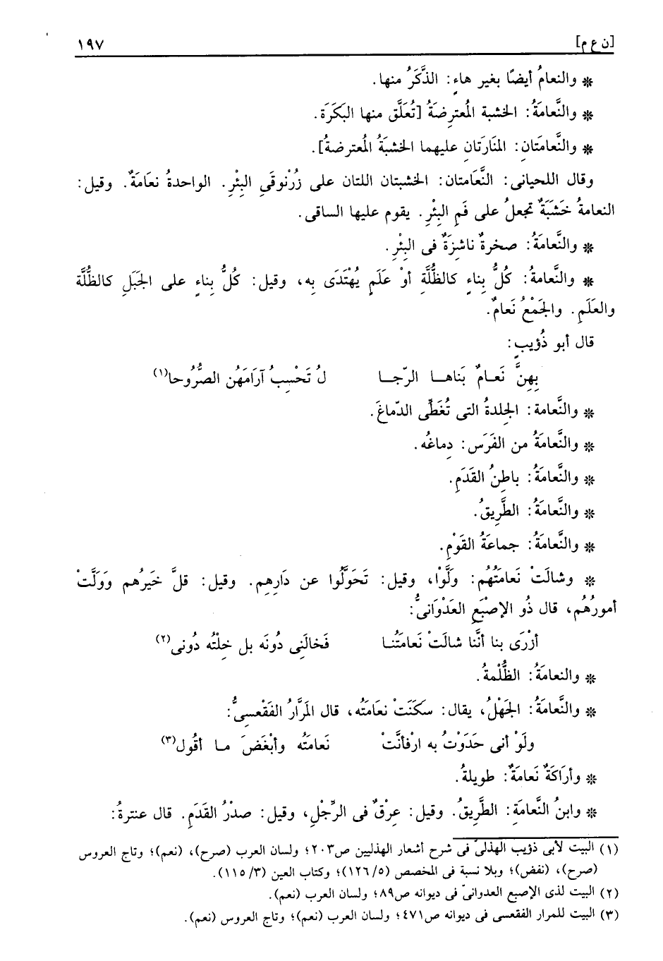والنَّعامَتانِ: المنارتان عَلَيْهِمَا الْخَشَبَة المعترضة. وَقَالَ اللحياني: النَّعَامتان: الخشبتان اللَّتَان على زرنوقي الْبِئْر. الْوَاحِدَة نَعامَةٌ. وَقيل النعامةُ خَشَبَة تجْعَل على فَم الْبِئْر. يقوم عَلَيْهَا الساقي.