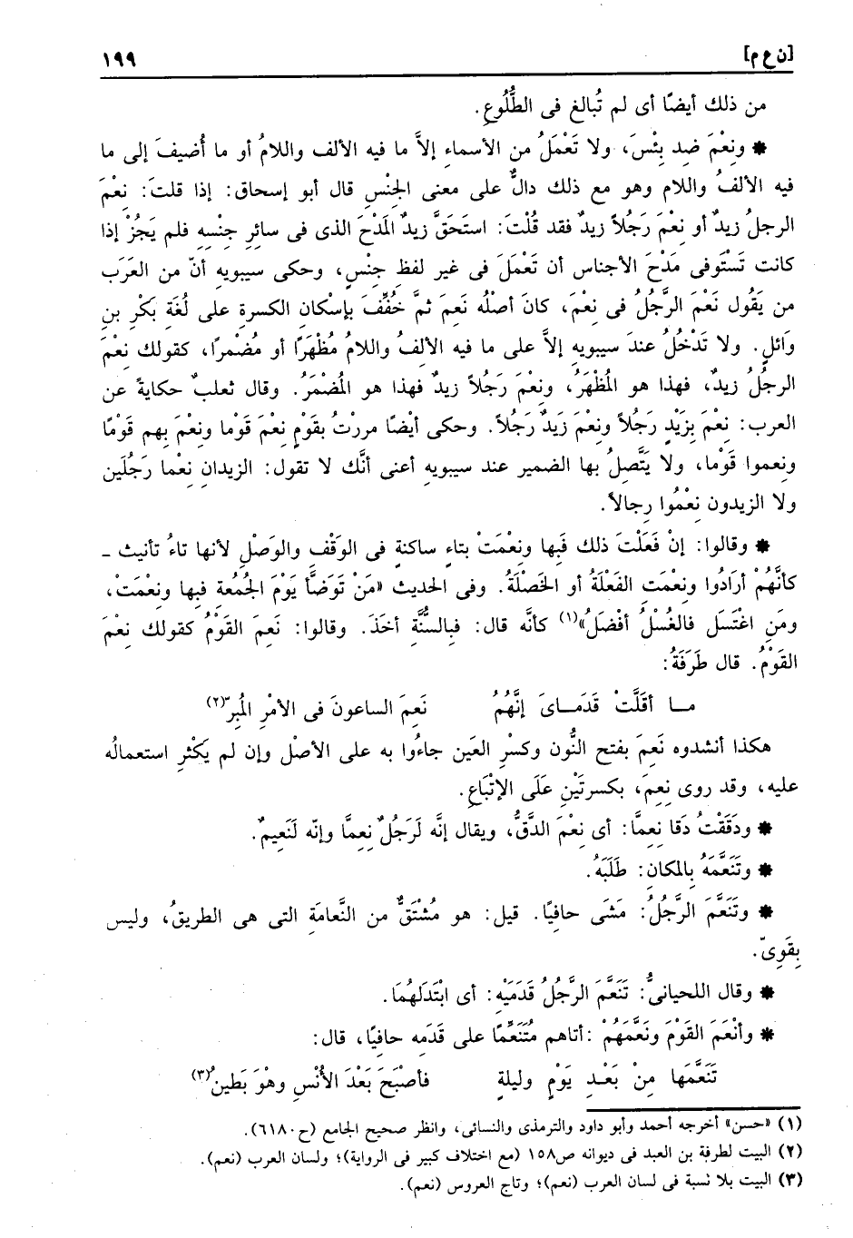 ونِعْمَ ضد بِئْسَ، وَلَا تعْمل من الْأَسْمَاء إِلَّا مَا فِيهِ الْألف وَاللَّام أَو مَا أضيف إِلَى مَا فِيهِ الْألف وَاللَّام وَهُوَ مَعَ ذَلِك دَال على معنى الْجِنْس قَالَ أَبُو إِسْحَاق: إِذا قلت زيد أَو نِعْمَ رجلا زيد فقد قلت: اسْتحق زيد الْمَدْح الَّذِي فِي سَائِر جنسه فَلم يجز إِذا كَانَت تستوفي مدح الْأَجْنَاس أَن تعْمل فِي غير لفظ جنس، وَحكى سِيبَوَيْهٍ أَن من الْعَرَب من يَقُول نَعْمَ الرجل فِي نِعْمَ، كَانَ أَصله نَعِمَ ثمَّ يُخَفف بِإِسْكَان الكسرة على لُغَة بكر بن وَائِل. وَلَا تدخل عِنْد سِيبَوَيْهٍ إِلَّا على مَا فِيهِ الْألف وَاللَّام مظْهرا أَو مضمرا، كَقَوْلِك نِعْمَ الرجل زيد، فَهَذَا هُوَ الْمظهر ونِعْمَ رجلا زيد فَهَذَا هُوَ الْمُضمر. وَقَالَ ثَعْلَب حِكَايَة عَن الْعَرَب: نِعْمَ بزيد رجلا ونِعْمَ زيد رجلا. وَحكى أَيْضا مَرَرْت بِقوم نِعْمَ قوما ونِعْمَ بهم قوما ونِعموا قوما، وَلَا يتَّصل بهَا الضَّمِير عِنْد سِيبَوَيْهٍ أَعنِي انك لَا تَقول: الزيدان نِعْما رجلَيْنِ وَلَا الزيدون نِعْمُوا رجَالًا.