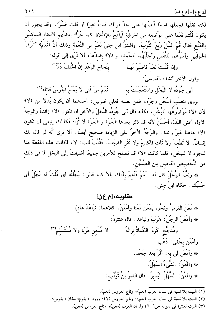 لكنه نقلهَا فَجَعلهَا اسْما فنصبها على حد قَوْلك قلت خيرا أَو قلت ضيرا. وَقد يجوز أَن يكون قُلْتُمْ نَعَما على مَوْضِعه من الحرفية فَيفتح للإطلاق كَمَا حرك بَعضهم لالتقاء الساكنين بِالْفَتْح فَقَالَ قُم اللَّيْل وبع الثَّوْب. واشتق ابْن جني نَعَمْ من النِّعْمَةِ وَذَلِكَ أَن " نَعَمْ " أشرف الجوابين وأسرُّهما للنَّفس وأجلبهما للحمد، و" لَا " بضدها، أَلا ترى إِلَى قَوْله: