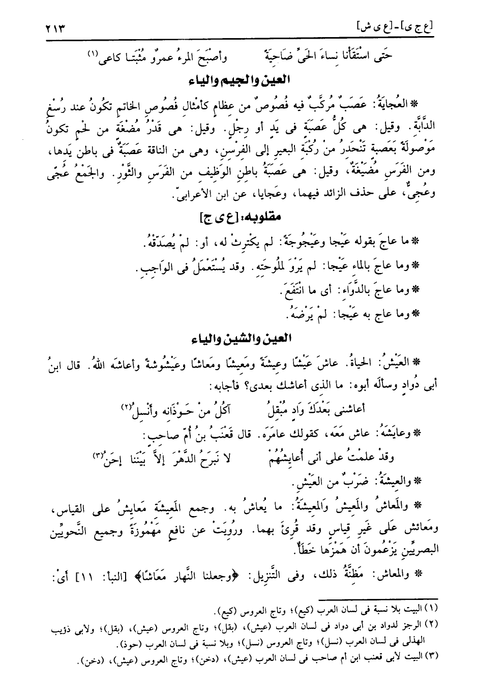 العَيْشُ: الْحَيَاة. عاشَ عَيْشا وعِيشَةً ومَعِيشا ومَعاشا وعَيْشُوشةً وأعاشه الله. قَالَ ابْن أبي دَاوُد وَسَأَلَهُ أَبوهُ: مَا الَّذِي أعاشك بعدِي؟ فَأَجَابَهُ: