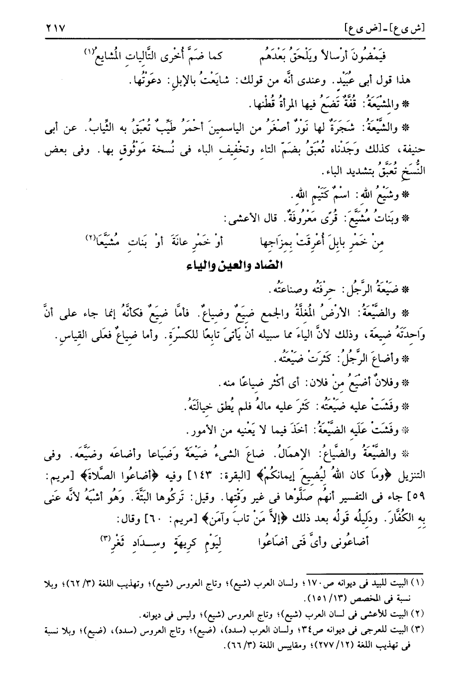والضَّيْعَةُ والضَّياعُ: الإهمال. ضاعَ الشَّيْء ضَيْعَةً وضَياعا وأضاعَه وضَيَّعَه. وَفِي التَّنْزِيل (وَمَا كَانَ اللهُ لِيُضِيعَ إيمانكُمْ) وَفِيه (أضاعُوا الصَّلاةَ) جَاءَ فِي التَّفْسِير انهم صلوها فِي غير وَقتهَا. وَقيل تركوها الْبَتَّةَ. وَهُوَ أشبه لِأَنَّهُ عَنى بِهِ الْكفَّار، وَدَلِيله قَوْله بعد ذَلِك (إلاَّ مَنْ تابَ وآمَن) وَقَالَ: