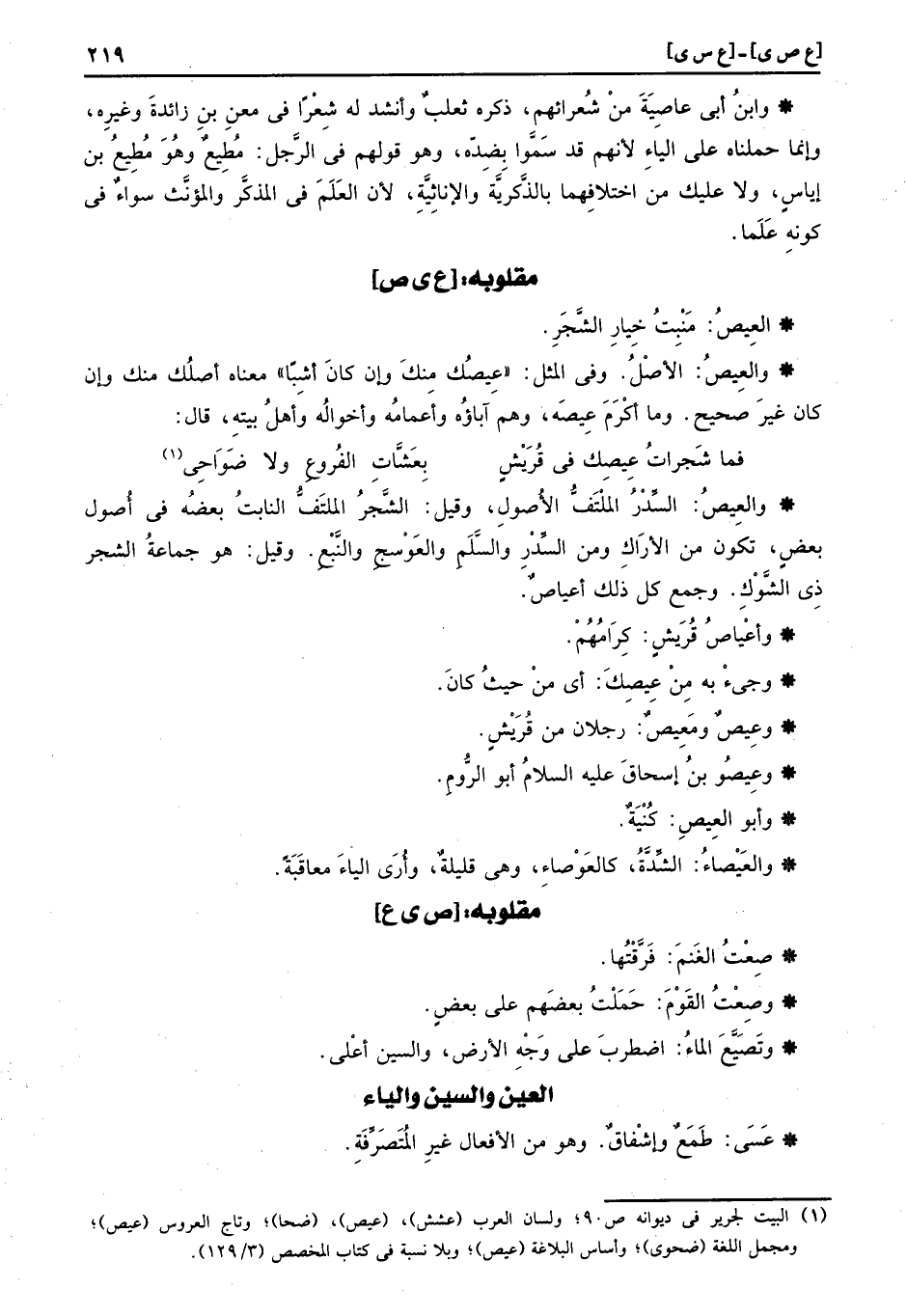 والعِيصُ: السدر الملتف الأُصول، وَقيل: الشّجر الملتف النَّابِت بعضه فِي أصُول بعض، تكون من الْأَرَاك وَمن السدر وَالسّلم والعوسج والنبع. وَقيل: هُوَ جمَاعَة الشّجر ذِي الشوك. وَجمع كل ذَلِك أعياص.