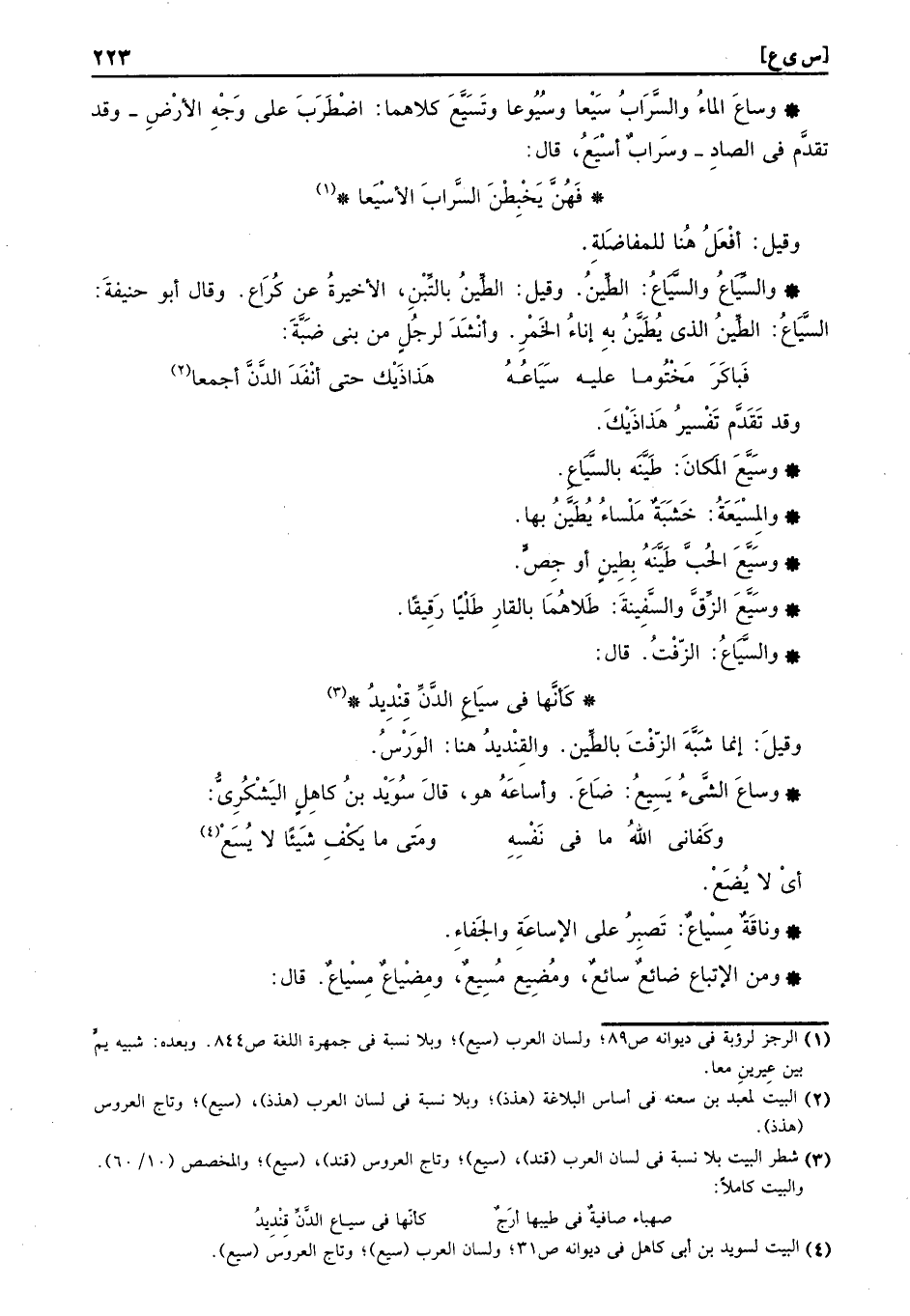 وساعَ المَاء والسراب سَيْعا وسُيُوعا وتَسَيَّعَ كِلَاهُمَا: اضْطربَ على وَجه الأَرْض - وَقد تقدم فِي الصَّاد - وسراب أسْيَعُ قَالَ: