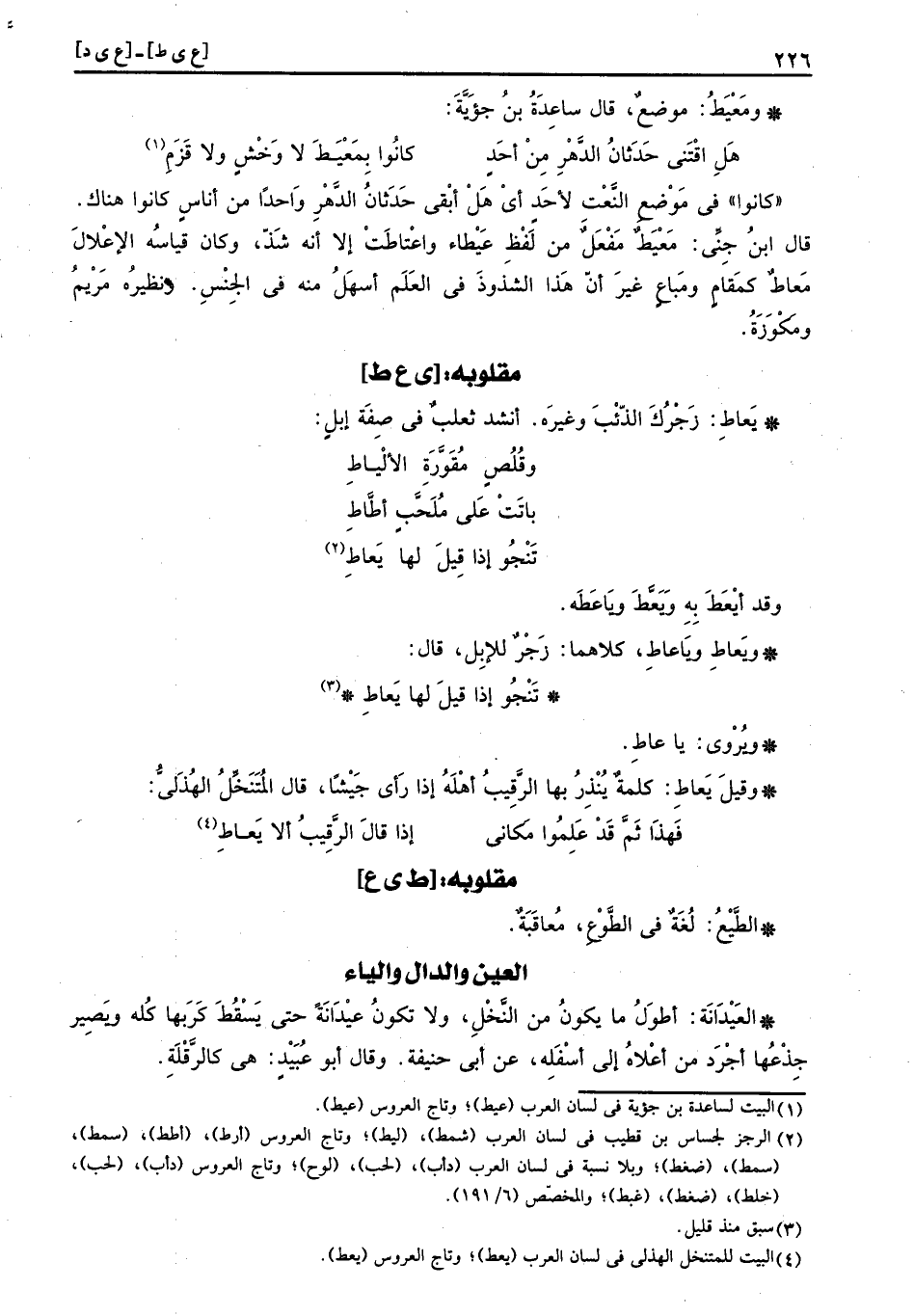 " كَانُوا " فِي مَوضِع النَّعْت لأحد أَي هَل أبقى حدثان الدَّهْر وَاحِدًا من أنَاس كَانُوا هُنَاكَ. قَالَ ابْن جني: مَعْيَطٌ مَفْعَلٌ من لفظ عَيْطاء واعْتاطَتْ إِلَّا انه شَذَّ، وَكَانَ قِيَاسه الإعلال مَعاطٌ كمقام ومَباعٍ غير أَن هَذَا الشذوذ فِي الْعلم أسهل مِنْهُ فِي الْجِنْس. وَنَظِيره مَرْيَم ومكوزة.