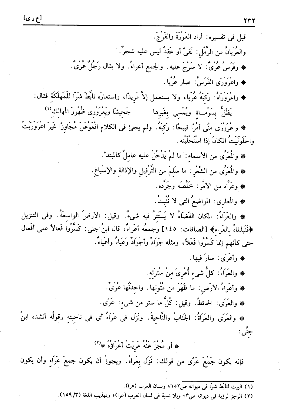 والعَرَى والعَرَاةُ: الجناب والناحية. وَنزل فِي عراه أَي فِي ناحيته وَقَوله أنْشدهُ ابْن جني: