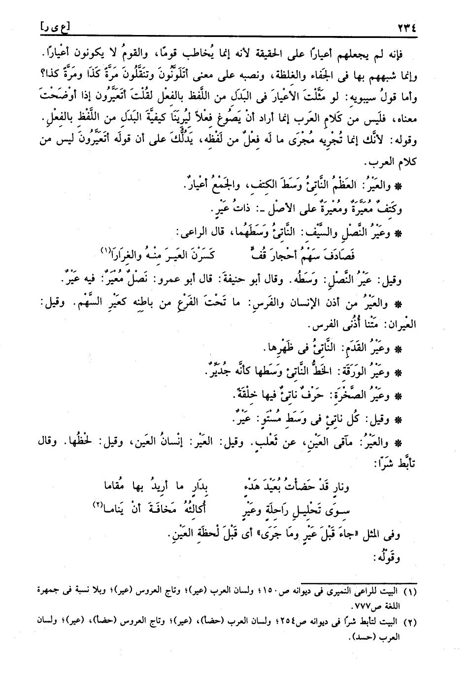 فَإِنَّهُ لم يجعلهم أعيارًا على الْحَقِيقَة لِأَنَّهُ إِنَّمَا يُخَاطب قوما، وَالْقَوْم لَا يكونُونَ أعياراً، وَإِنَّمَا شبههم بهَا فِي الْجفَاء والغلظة، ونصبه على معنى أتلونون وتنقلون مرّة كَذَا وَمرَّة كَذَا؟ وَأما قَول سِيبَوَيْهٍ: لَو مثلت الأعيار فِي الْبَدَل من اللَّفْظ بِالْفِعْلِ لَقلت أتعيرون إِذا أوضحت مَعْنَاهُ، فَلَيْسَ من كَلَام الْعَرَب إِنَّمَا أَرَادَ أَن يصوغ فعلا ليرينا كَيْفيَّة الْبَدَل من اللَّفْظ بِالْفِعْلِ. وَقَوله: لِأَنَّك إِنَّمَا تجريه مجْرى مَاله فعل من لَفظه، يدلك على أَن قَوْله أتعيرون لَيْسَ من كَلَام الْعَرَب.