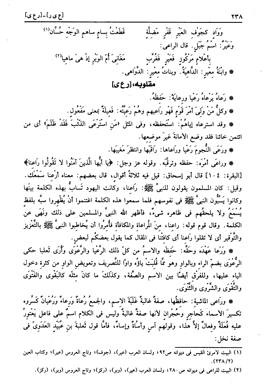 وراعَى أمره: حفظه وترقبه. وَقَوله عز وَجل (يَا أيُّها الَّذينَ آمَنُوا لَا تَقُولُوا رَاعِنا) قَالَ أَبُو إِسْحَاق: قيل فِيهِ ثَلَاثَة أَقْوَال، قَالَ بَعضهم: مَعْنَاهُ أرعِنا سَمعك. وَقيل: كَانَ الْمُسلمُونَ يَقُولُونَ للنَّبِي صَلَّى اللهُ عَلَيْهِ وَسَلَّمَ: رَاعِنا، وَكَانَت الْيَهُود تساب بِهَذِهِ الْكَلِمَة بَينهَا وَكَانُوا يسبون النَّبِي صَلَّى اللهُ عَلَيْهِ وَسَلَّمَ فِي نُفُوسهم فَلَمَّا سمعُوا هَذِه الْكَلِمَة اغتنموا أَن يظهروا سبه بِلَفْظ يسمع وَلَا يلحقهم فِي ظَاهره شَيْء، فأظهر الله النَّبِي وَالْمُسْلِمين على ذَلِك وَنهى عَن الْكَلِمَة. وَقَالَ قوم قَوْله: راعِنا، من المراعاة والمكافأة فأُمروا أَن يخاطبوا النَّبِي صَلَّى اللهُ عَلَيْهِ وَسَلَّمَ بالتعزيز والتوقير أَي لَا تَقولُوا رَاعنا أَي كافئنا فِي الْمقَال كَمَا يَقُول بَعْضكُم لبَعض.