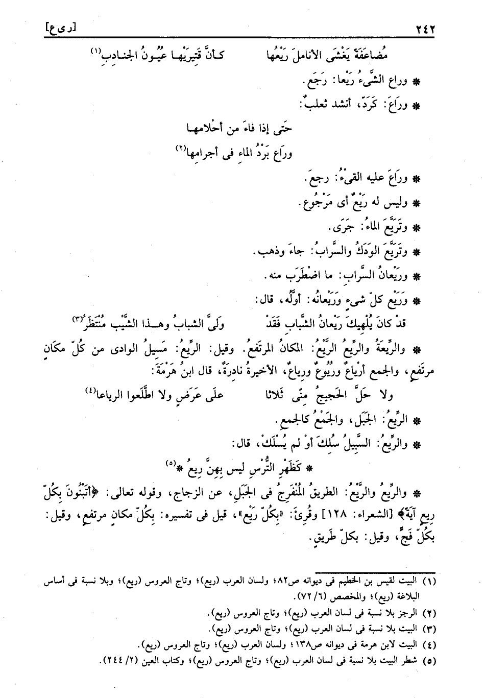والرِّيعُ والرَّيْعُ: الطَّرِيق المنفرج فِي الْجَبَل، عَن الزّجاج، وَقَوله تَعَالَى (أتَبْنُونَ بِكُلّ رِيعٍ آيَةً) وقريء: بِكُل رَيْع، قيل فِي تَفْسِيره: بِكُل مَكَان مُرْتَفع، وَقيل: بِكُل فج، وَقيل: بِكُل طَرِيق.