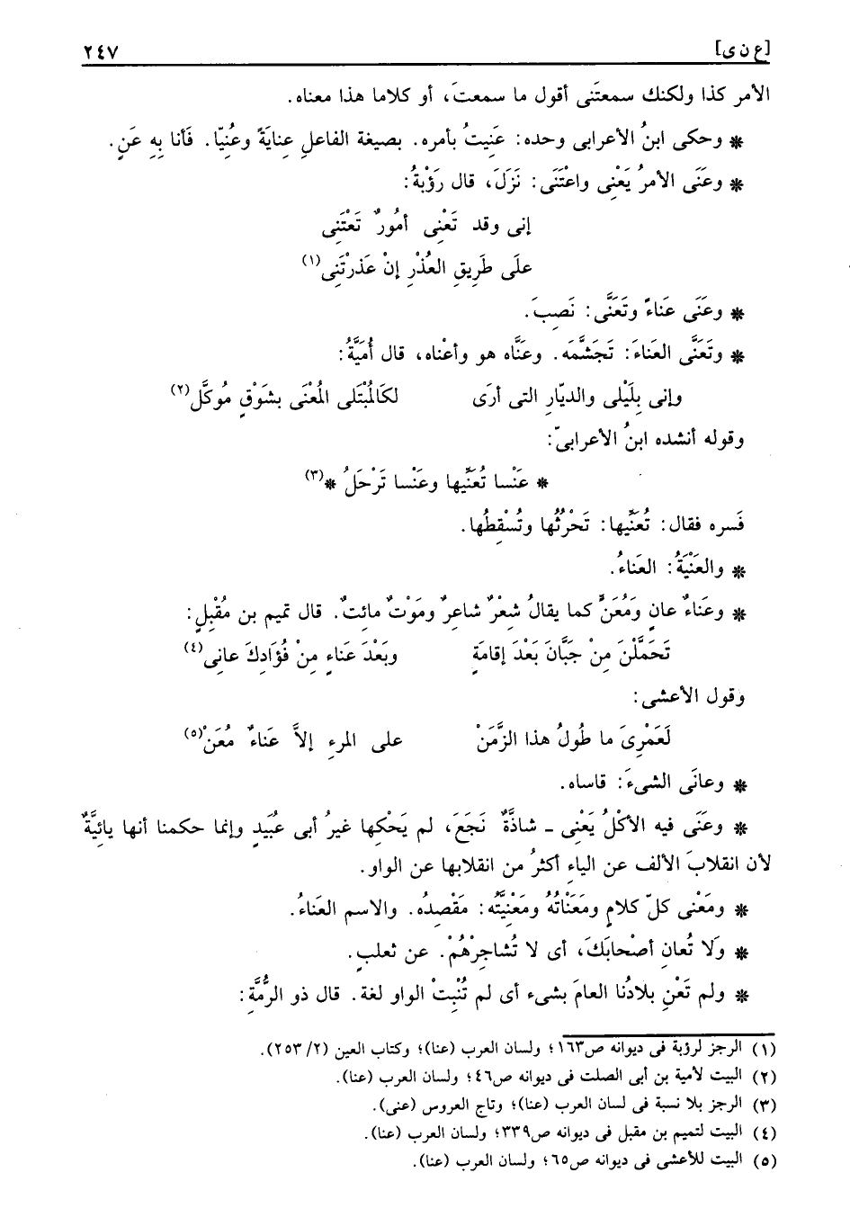 الْأَمر كَذَا وَلَكِنَّك سمعتني أَقُول مَا سَمِعت، أَو كلَاما هَذَا مَعْنَاهُ وَحكى ابْن الْأَعرَابِي وَحده: عَنِيتُ بأَمْره. بِصِيغَة الْفَاعِل عِنايَةً وعُنِياًّ. فَأَنا بِهِ عَن.
