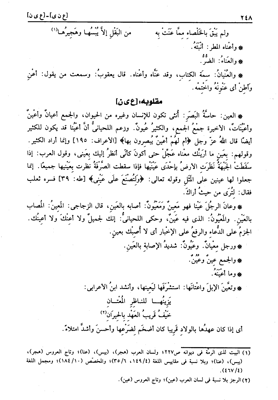 الْعين: حاسة الْبَصَر: أُنْثَى تكون للْإنْسَان وَغَيره من الْحَيَوَان، وَالْجمع أعيانٌ وأعْين وأعْيُناتٌ، الْأَخِيرَة جمع الْجمع، وَالْكثير عُيون. وَزعم اللحياني أَن أعينا قد يكون للكثير أَيْضا قَالَ الله عز وَجل (أم لهُمْ أعْينٌ يُبصرون بهَا) وَإِنَّمَا أَرَادَ الْكثير. وَقَوْلهمْ: بِعَين مَا أرَينَّك مَعْنَاهُ عجل حَتَّى أكون كَأَنِّي أنظر إِلَيْك بعيني وَقَول الْعَرَب: إِذا سَقَطت الْجَبْهَة نَظَرَت الأَرْض بِإِحْدَى عينيها فَإِذا سَقَطت الصرفة نظرت بعينيها جَمِيعًا. إِنَّمَا جعلُوا لَهَا عينين على الْمثل وَقَوله تَعَالَى (وَلِتُصْنَعَ عَلى عَيْنِي) فسره ثَعْلَب فَقَالَ: لترى من حَيْثُ أَرَاك.
