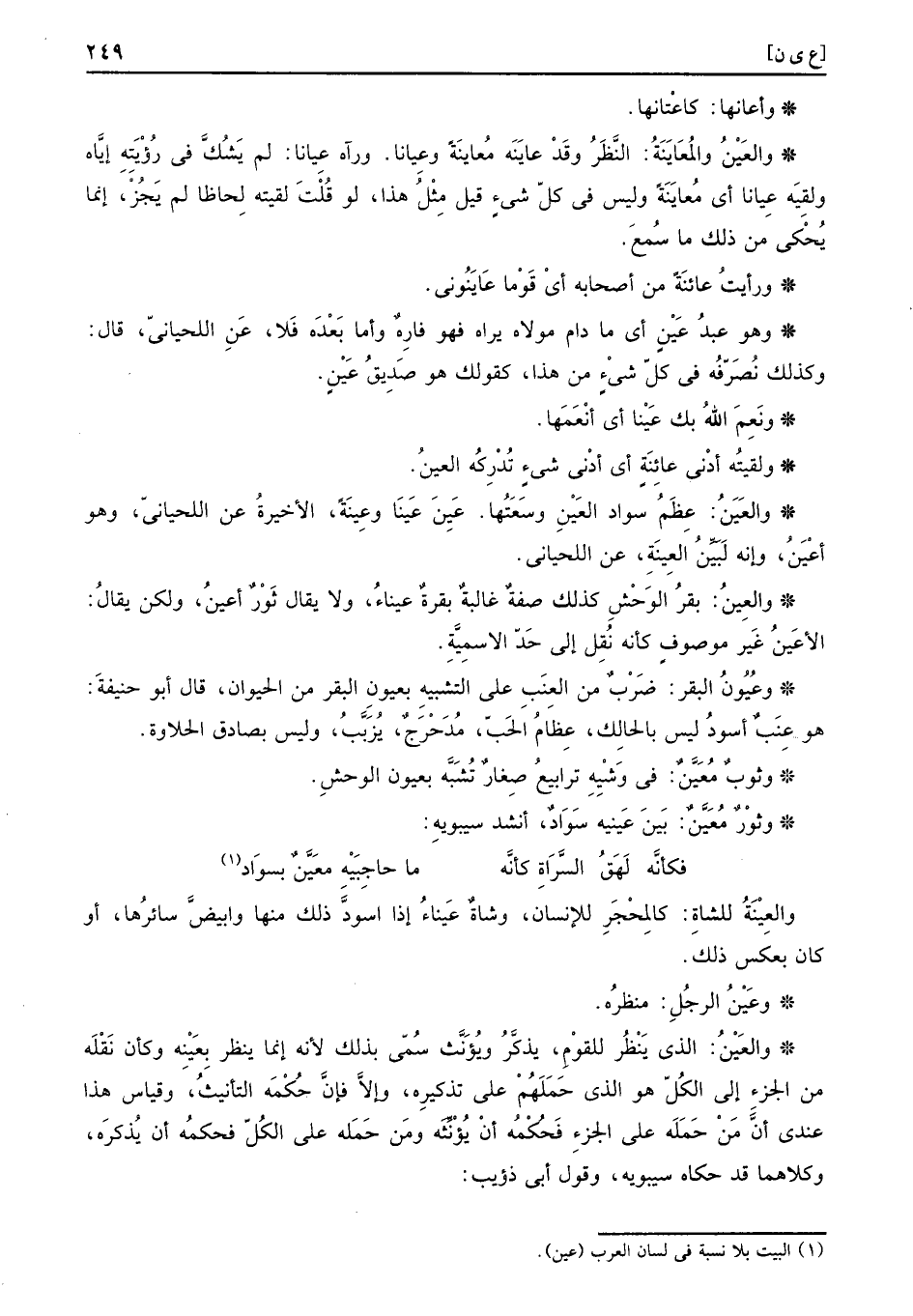 والعِينُ: بقر الْوَحْش كَذَلِك صفة غالبة. بقرة عيناء، وَلَا يُقَال ثَوْر أعينُ، وَلَكِن يُقَال: الأعَينَ غير مَوْصُوف كَأَنَّهُ نقل إِلَى حد الاسمية.