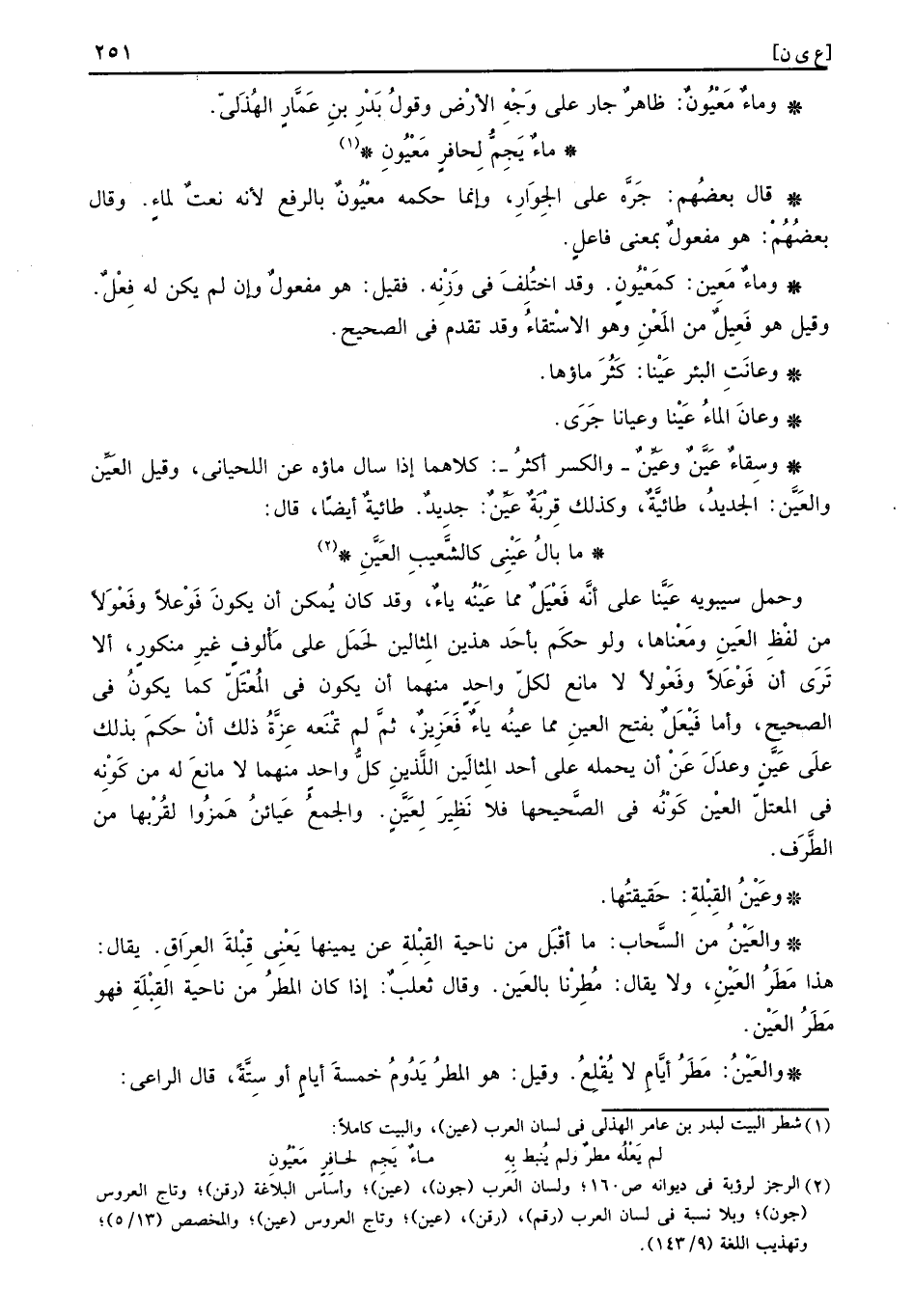وَحمل سِيبَوَيْهٍ عينا على انه فعيل مِمَّا عينه يَاء، وَقد كَانَ يُمكن أَن يكون فوعلا وفعولا من لفظ العَينِ وَمَعْنَاهَا، وَلَو حكم بِأحد هذَيْن المثالين لحمل على مألوف غير منكور، أَلا ترى أَن فوعلا وفعولا لَا مَانع لكل وَاحِد مِنْهُمَا أَن يكون فِي المعتل كَمَا يكون فِي الصَّحِيح، وَأما فيعل بِفَتْح العينِ مِمَّا عيْنَه يَاء فعزيز، ثمَّ لم تَمنعهُ عزة ذَلِك أَن حكم بذلك على عَيَّنٍ وَعدل عَن أَن يحملهُ على أحد المثالين اللَّذين كل وَاحِد مِنْهُمَا لَا مَانع لَهُ من كَونه فِي المعتل العْين كَونه فِي الصحيحها فَلَا نَظِير لِعَيَّنٍ. وَالْجمع عيائن همزوا لقربها من الطّرف.