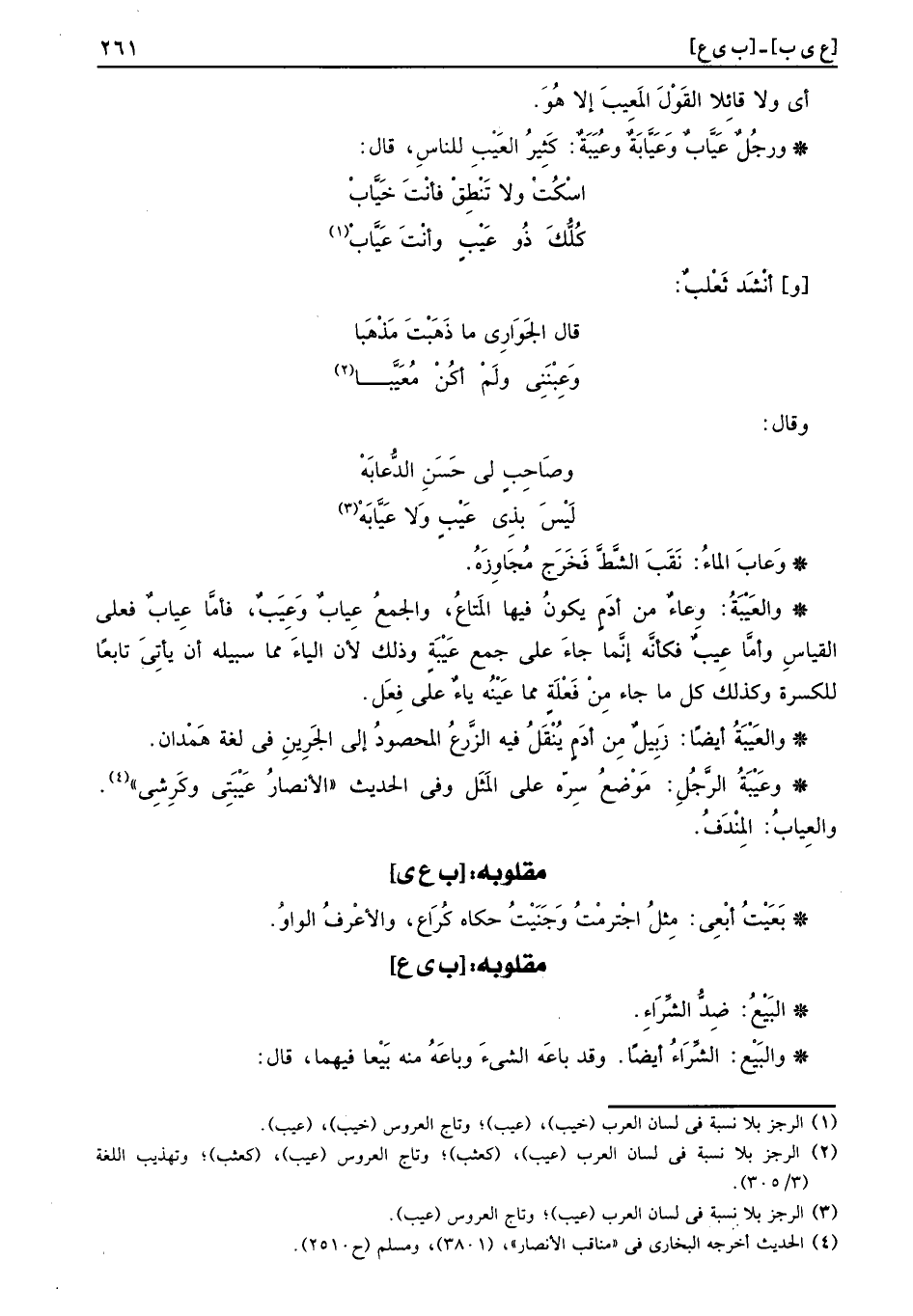 والعَيْبَةُ: وعَاء من ادم يكون فِيهَا الْمَتَاع، وَالْجمع عِيابٌ وعِيَبٌ، فَأَما عِيابٌ فعلى الْقيَاس وَأما عيب فَكَأَنَّهُ إِنَّمَا جَاءَ على جمع عَيْبَة وَذَلِكَ لِأَن الْيَاء مِمَّا سَبيله أَن يَأْتِي تَابعا للكسرة وَكَذَلِكَ كل مَا جَاءَ من فعلة مِمَّا عينه يَاء على فعل.