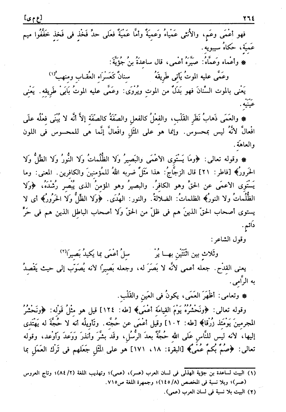 والعَمَى ذهَاب نظر الْقلب، وَالْفِعْل كالفعل وَالصّفة كالصفة إِلَّا انه لَا يُبني فِعْلُه على افْعالَّ لِأَنَّهُ لَيْسَ بمحسوس، وَإِنَّمَا هُوَ على الْمثل وافْعالَّ إِنَّمَا هِيَ للمحسوس فِي اللَّوْن والعاهة.
