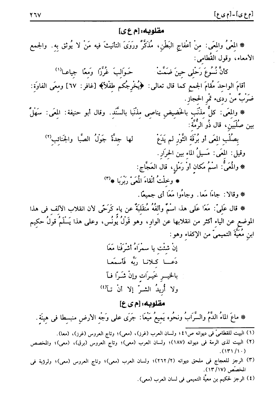 المِعْيُ والمِعَي: من أعفاج الْبَطن، مُذَكّر وروى التانيث فِيهِ من لَا يوثق بِهِ، وَالْجمع الأمعاء، وَقَول الْقطَامِي: