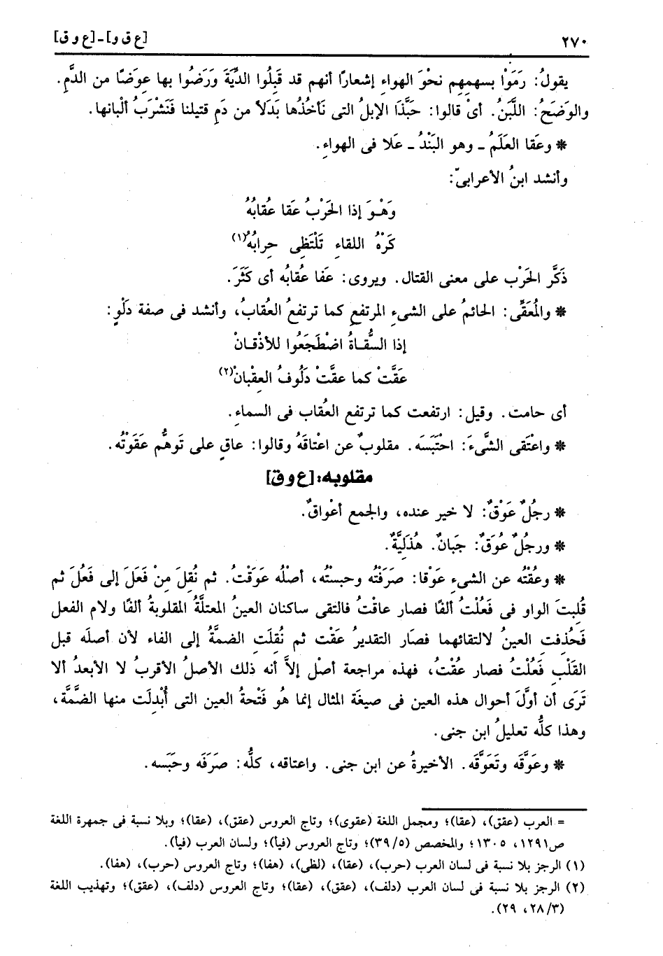 وعُقْتُه عَن الشَّيْء عَوْقا: صرفته وحبسته، أَصله عَوَقْتُ، ثمَّ نقل من فَعَلَ إِلَى فَعُلَ ثمَّ قلبت الْوَاو فِي فَعُلْتُ ألفا فَصَارَ عاقْتُ فَالتقى ساكنان الْعين المعتلة المقلوبة ألفا وَلَام الْفِعْل فحذفت الْعين لالتقائهما فَصَارَ التَّقْدِير عَقْت ثمَّ نُقلت الضمة إِلَى الْفَاء لِأَن أَصله قبل الْقلب فَعُلْتُ فَصَارَ عُقْتُ، فَهَذِهِ مُرَاجعَة أصل إِلَّا أَنه ذَلِك الأَصْل الْأَقْرَب لَا الْأَبْعَد أَلا ترى أَن أول أَحْوَال هَذِه الْعين فِي صِيغَة الْمِثَال إِنَّمَا هُوَ فَتْحة الْعين الَّتِي أُبدلت مِنْهَا الضمة، وَهَذَا كُله تَعْلِيل ابْن جني.