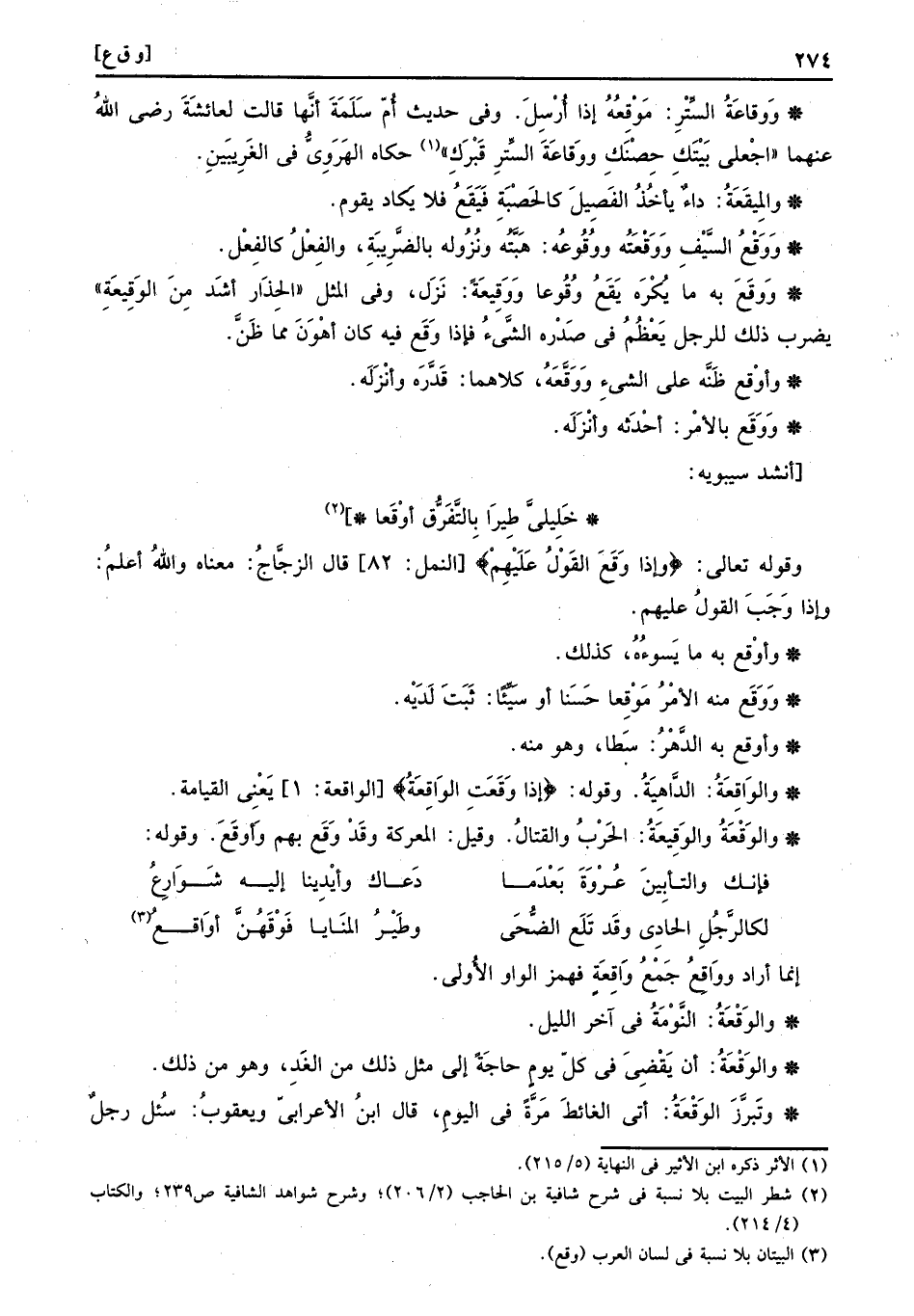 والوَقْعَةُ والوَقِيعَةُ: الْحَرْب والقتال. وَقيل: المعركة وَقد وَقَع بهم وأوقَعَ. وَقَوله: