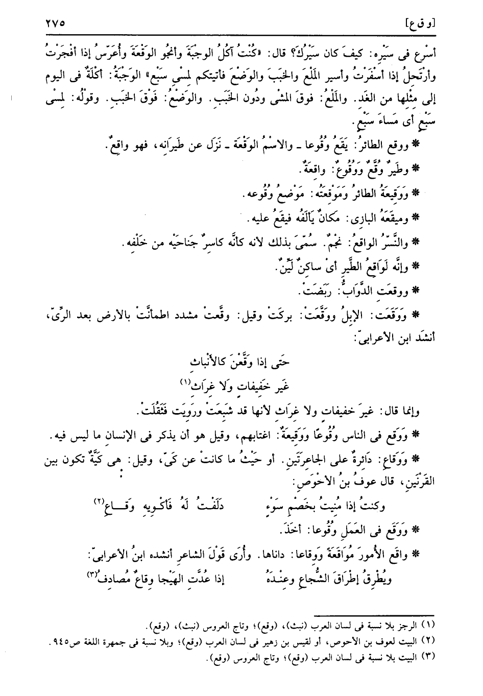 ووَقَعَت: الْإِبِل ووَقَّعَتْ: بَركت وَقيل وقَّعتْ مشدد اطمأنَّت بِالْأَرْضِ بعد الرّيّ أنْشد ابْن الْأَعرَابِي: