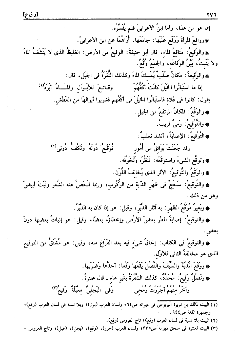 والوَقيعُ: مَناقعُ المَاء، قَالَ أَبُو حنيفَة: الوقيعُ من الأَرْض: الغليظ الَّذِي لَا ينشف المَاء وَلَا ينْبت، بيِّن الوَقاعَةِ، وَالْجمع وُقُعٌ.