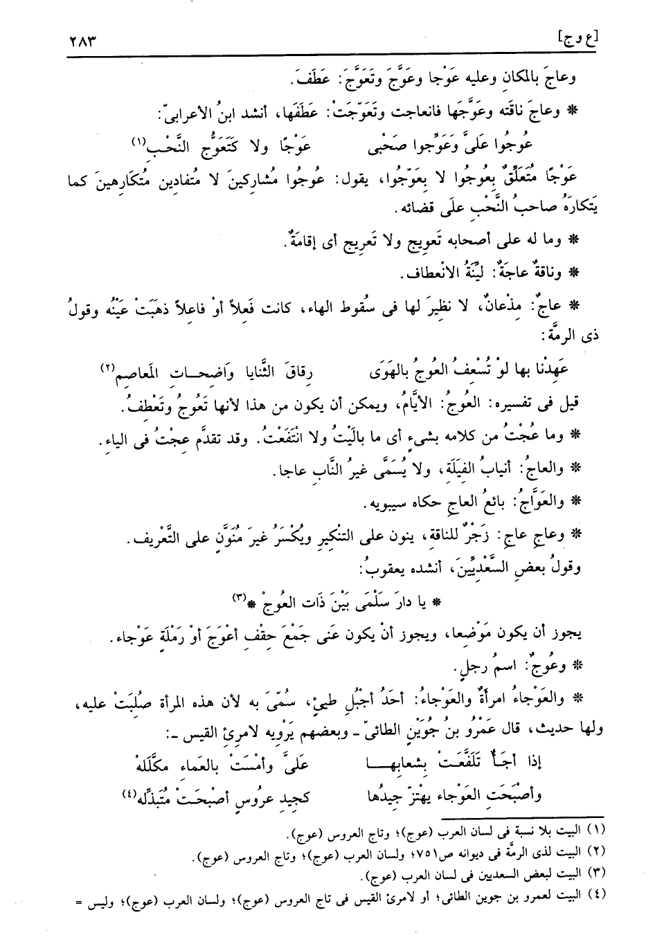 وعاجَ بالمكانِ وَعَلِيهِ عَوْجا وعَوَّجَ وتَعَوَّجَ: عَطَفَ.