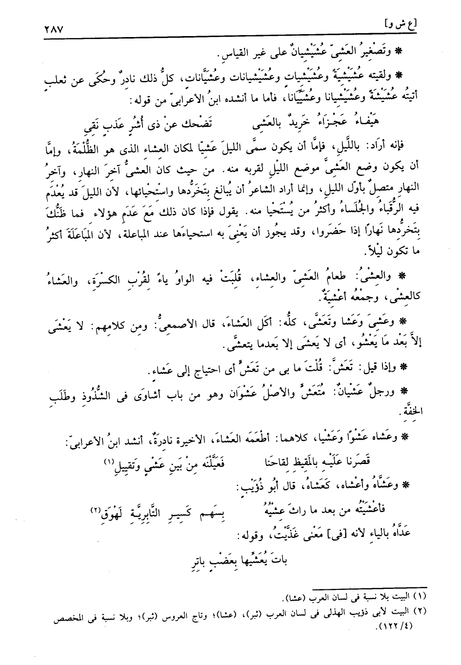 ولقيته عُشَيْشِيَةً وعُيَشْيِشياتٍ وعُشَيْشيانات وعُشَيَّاناتٍ، كل ذَلِك نَادِر وَحكى عَن ثَعْلَب أَتَيْته عُشَيْشَةً وعُشَيْشِيانا وعُشَيِّيَانا، فَأَما مَا أنْشدهُ ابْن الْأَعرَابِي من قَوْله: