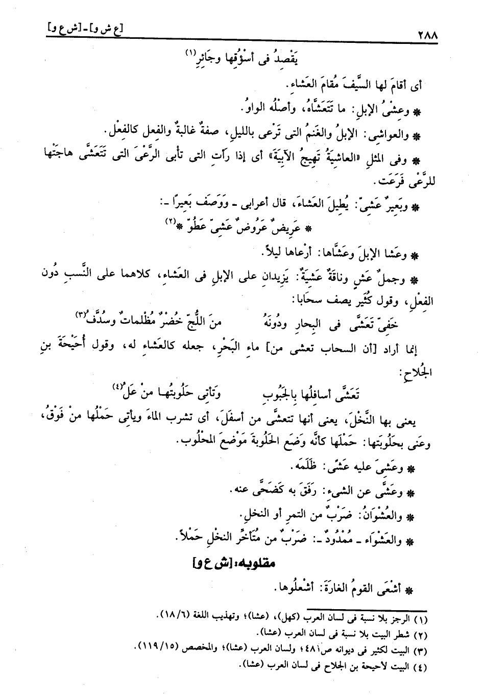 والعواشِي: الْإِبِل وَالْغنم الَّتِي ترعى بِاللَّيْلِ، صفة غالبة وَالْفِعْل كالفعل.