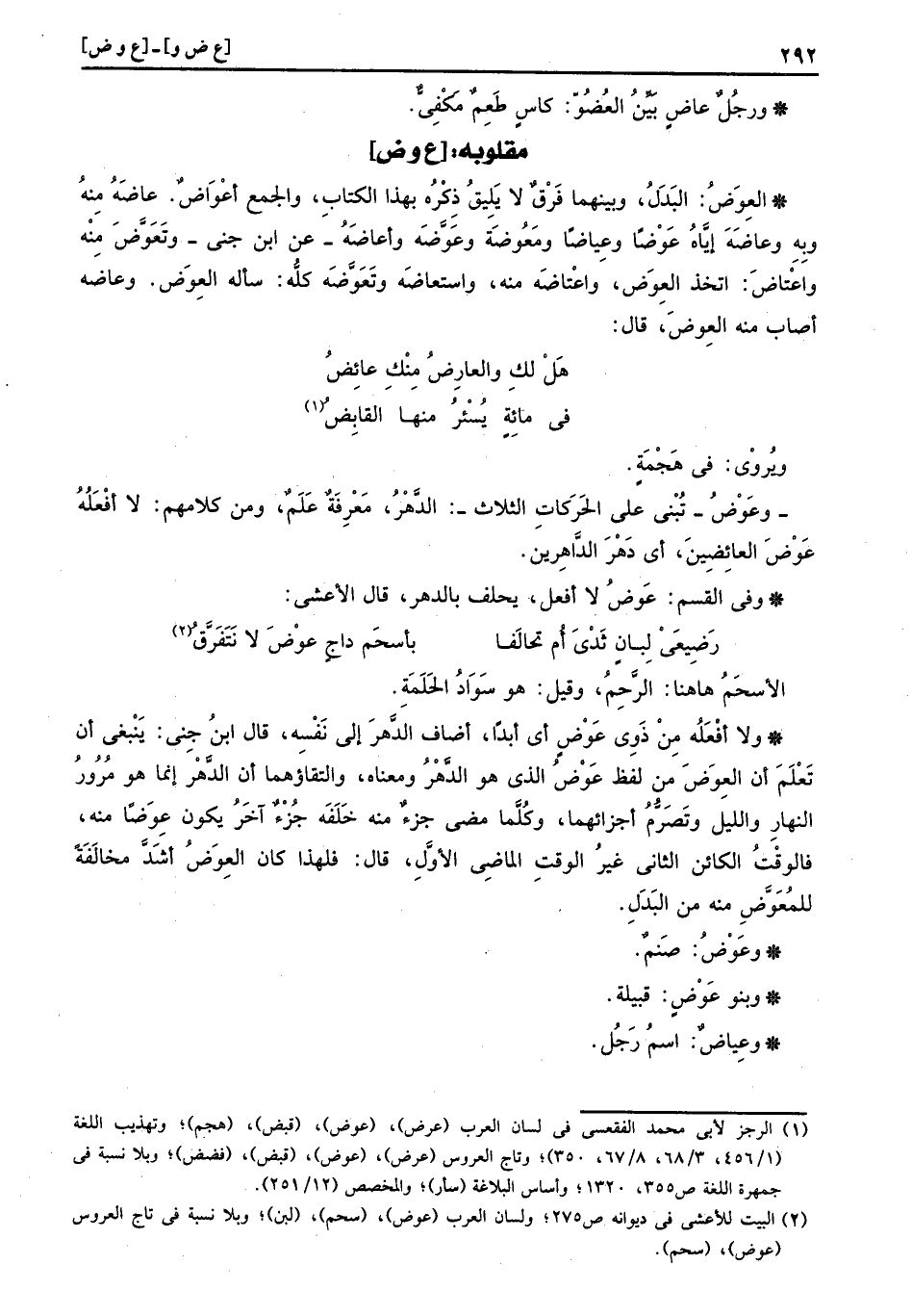 وَعوض - تبنى على الحركات الثَّلَاث -: الدَّهْر، معرفَة علم، وَمن كَلَامهم: لَا أفْعَلُهُ عَوْضَ العائِضِينَ، أَي دَهْرَ الداهرين.