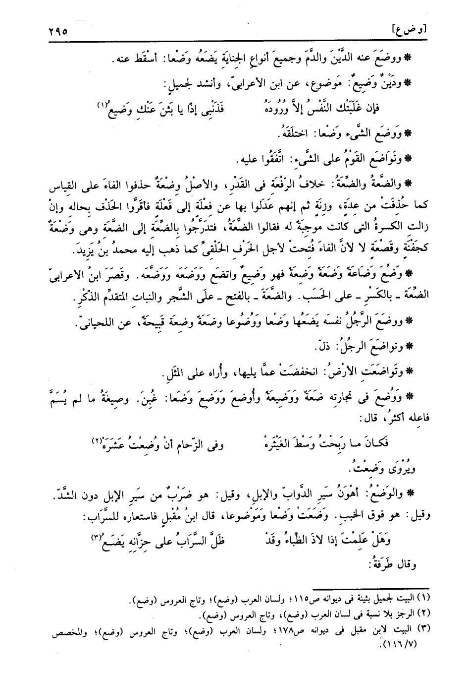 وَدين وَضِيعٌ: مَوْضُوع، عَن ابْن الْأَعرَابِي، وَأنْشد لجميل: