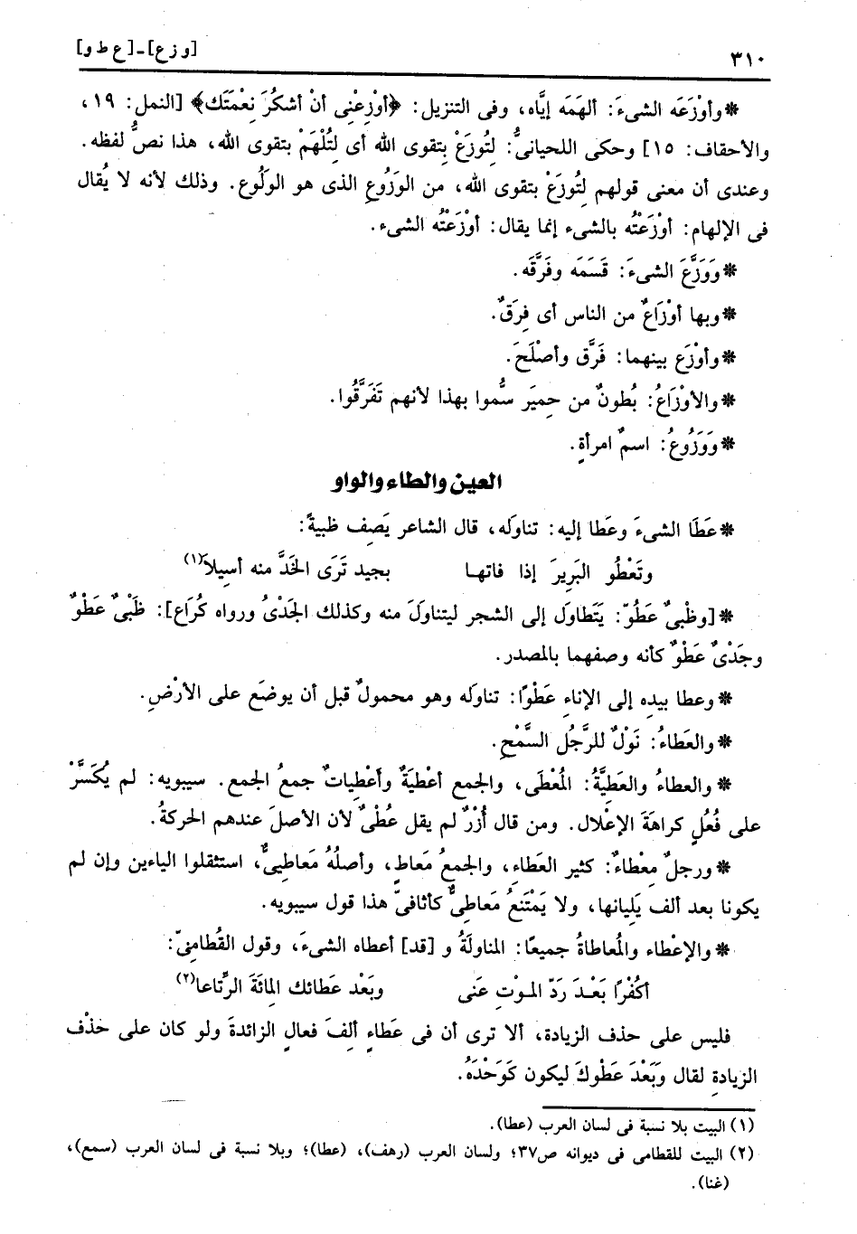 والعطاءُ والعَطِيَّة: المُعْطَى، وَالْجمع أعْطيَةٌ وأَعْطِياتٌ جمع الْجمع. سِيبَوَيْهٍ: لم يكسر على فُعُلٍ كَرَاهَة الإعلال. وَمن قَالَ أُزْرٌ لم يقل عُطْىٌ لِأَن الأَصْل عِنْدهم الْحَرَكَة.