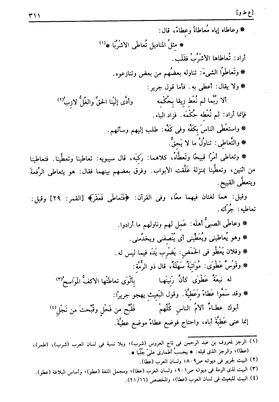 يتعاطى أمرا قبيحا وتَعطَّاهُ، كِلَاهُمَا: رَكبه قَالَ سِيبَوَيْهٍ: تعاطينا وتعطَّينا. فتعاطينا من اثْنَيْنِ، وتعطَّينا بِمَنْزِلَة غَلَّقت الْأَبْوَاب. وَفرق بَعضهم بَينهمَا فَقَالَ: هُوَ يتعاطى الرّفْعَة ويتعطَّى الْقَبِيح. وَقيل هما لُغَتَانِ فيهمَا مَعًا، وَفِي الْقُرْآن (فَتَعاطَى فَعَقَرَ) وَقيل: تعطيه: جرأته.
