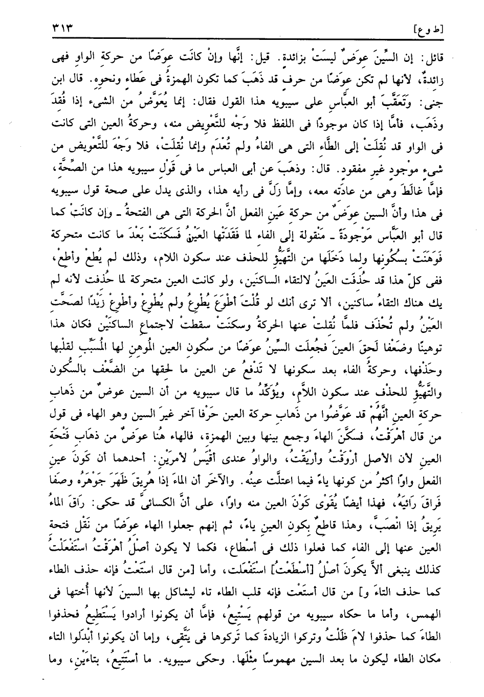 قَائِل: إِن السِّين عوض لَيست بزائدة. قيل: إِنَّهَا وَإِن كَانَت عوضا من حَرَكَة الْوَاو فَهِيَ زَائِدَة، لِأَنَّهَا لم تكن عوضا من حرف قد ذهبت كَمَا تكون الْهمزَة فِي عَطاء وَنَحْوه. قَالَ ابْن جني: وتعقَّب أَبُو الْعَبَّاس على سِيبَوَيْهٍ هَذَا القَوْل فَقَالَ: إِنَّمَا يعوَّض من الشَّيْء إِذا فقد وَذهب، فَأَما إِذا كَانَ مَوْجُودا فِي اللَّفْظ فَلَا وَجه للتعويض مِنْهُ، وحركة الْعين الَّتِي كَانَت فِي الْوَاو قد نقلت إِلَى الطَّاء الَّتِي هِيَ الْفَاء وَلم تُعدم وَإِنَّمَا نقلت، فَلَا وَجه للتعويض من شَيْء مَوْجُود غير مَفْقُود. قَالَ: وَذهب عَن أبي الْعَبَّاس مَا فِي قَول سِيبَوَيْهٍ هَذَا من الصِّحَّة، فإمَّا غالط وَهِي من عَادَته مَعَه، وإمَّا زلَّ فِي رَأْيه. هَذَا، وَالَّذِي يدل على صِحَة قَول سِيبَوَيْهٍ فِي هَذَا وَأَن السِّين عوض من حَرَكَة عين الْفِعْل أَن الْحَرَكَة الَّتِي هِيَ الفتحة - وَإِن كَانَت كَمَا قَالَ أَبُو الْعَبَّاس مَوْجُودَة - منقولة إِلَى الْفَاء لما فقدتها الْعين فسكنت بعد مَا كَانَت متحركة فوهنت بسكونها وَلما دَخلهَا من التهيؤ للحذف عِنْد سُكُون اللَّام، وَذَلِكَ لم يُطعْ وأطِعْ، فَفِي كل هَذَا قد حُذفت الْعين لالتقاء الساكنين، وَلَو كَانَت الْعين متحركة لما حذفت لِأَنَّهُ لم يَك هُنَاكَ التقاء ساكنين، أَلا ترى انك لَو قلت أطْوَعَ يُطْوِعُ وَلم يُطْوِعْ وأطْوِعْ زيدا لصحَّت الْعين وَلم تحذف فَلَمَّا نقلت عَنْهَا الْحَرَكَة وسكنت سَقَطت لِاجْتِمَاع الساكنين فَكَانَ هَذَا توهينا وضعفا لحق الْعين فجُعلت السِّين عوضا من سُكُون الْعين الموهن لَهَا الْمُسَبّب لقلبها وحذفها، وحركة الْفَاء بعد سكونها لَا تدفع عَن الْعين مَا لحقها من الضعْف بِالسُّكُونِ والتهيؤ للحذف عِنْد سُكُون اللَّام، ويؤكد مَا قَالَ سِيبَوَيْهٍ من أَن السِّين عوض من ذهَاب حَرَكَة الْعين أنَّهم قد عوَّضوا من ذهَاب حَرَكَة الْعين حرفا آخر غير السِّين وَهُوَ الْهَاء فِي قَول من قَالَ أهْرَقْتُ، فسكن الْهَاء وَجمع بَينهَا وَبَين الْهمزَة، فالهاء هُنَا عوض من ذهَاب فَتْحة الْعين لِأَن الأَصْل أرْوَقْتُ وأرْيَقْتُ، وَالْوَاو عِنْدِي أَقيس لأمرين: أَحدهمَا أَن كَون عين الْفِعْل واوا أَكثر من كَونهَا يَاء فِيمَا اعتلَّت عينه وَالْآخر أَن المَاء إِذا هُرِيقَ ظهر جوهره وَصفا فِرَاق رائيه، فَهَذَا أَيْضا يُقَوي كَون الْعين مِنْهُ واوا، على أَن الْكسَائي قد حكى: راق المَاء يريق إِذا انصبَّ، وَهَذَا قَاطع بِكَوْن الْعين يَاء، ثمَّ إِنَّهُم جعلُوا الْهَاء عوضا من نقل فَتْحة الْعين عَنْهَا إِلَى الْفَاء كَمَا فعلوا ذَلِك فِي أسْطاع، فَكَمَا لَا يكون أصل أهْرَقْتُ اسْتَفْعَلْتُ كَذَلِك يَنْبَغِي أَلا يكون أصل أسْطَعْتُ اسْتَفْعَلت، وَأما من قَالَ اسْتَعْتُ فَإِنَّهُ حذف الطَّاء كَمَا حذف التَّاء وَمن قَالَ استَعْت فَإِنَّهُ قلب الطَّاء تَاء ليشاكل بهَا السِّين لِأَنَّهَا أُختها فِي الهمس، وَأما مَا حَكَاهُ سِيبَوَيْهٍ من قَوْلهم يَسْتِيعُ، فإمَّا أَن يَكُونُوا أَرَادوا يَسْتَطِيعُ فحذفوا الطَّاء كَمَا حذفوا لَام ظلت وَتركُوا الزِّيَادَة كَمَا تركوها فِي يتَّقي، وَإِمَّا أَن يكون أبدلوا التَّاء مَكَان الطَّاء ليَكُون مَا بعد السِّين مهموسا مثلهَا. وَحكى سِيبَوَيْهٍ مَا أسْتَتِيعُ، بتاءين، وَمَا
