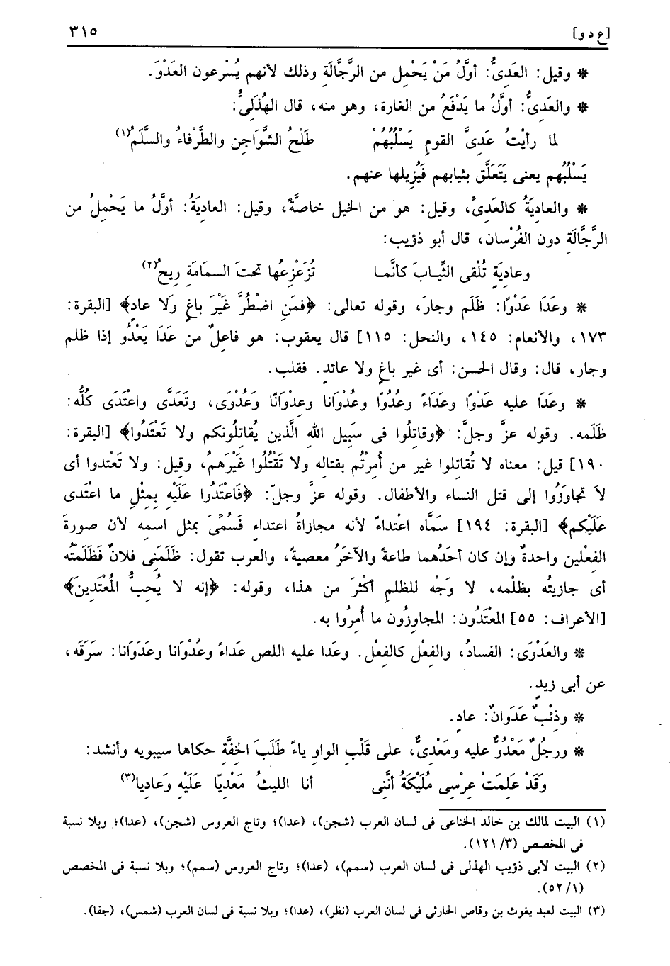 وعَدَا عَدْواً: ظلم وجار، وَقَوله تَعَالَى (فمَنِ اضْطُرَّ غَيْرَ باغٍ وَلَا عادٍ) قَالَ يَعْقُوب: هُوَ فَاعل من عَدَا يَعْدُو إِذا ظلم وجار، قَالَ: وَقَالَ الْحسن: أَي غير بَاغ وَلَا عَائِد. فَقلب.