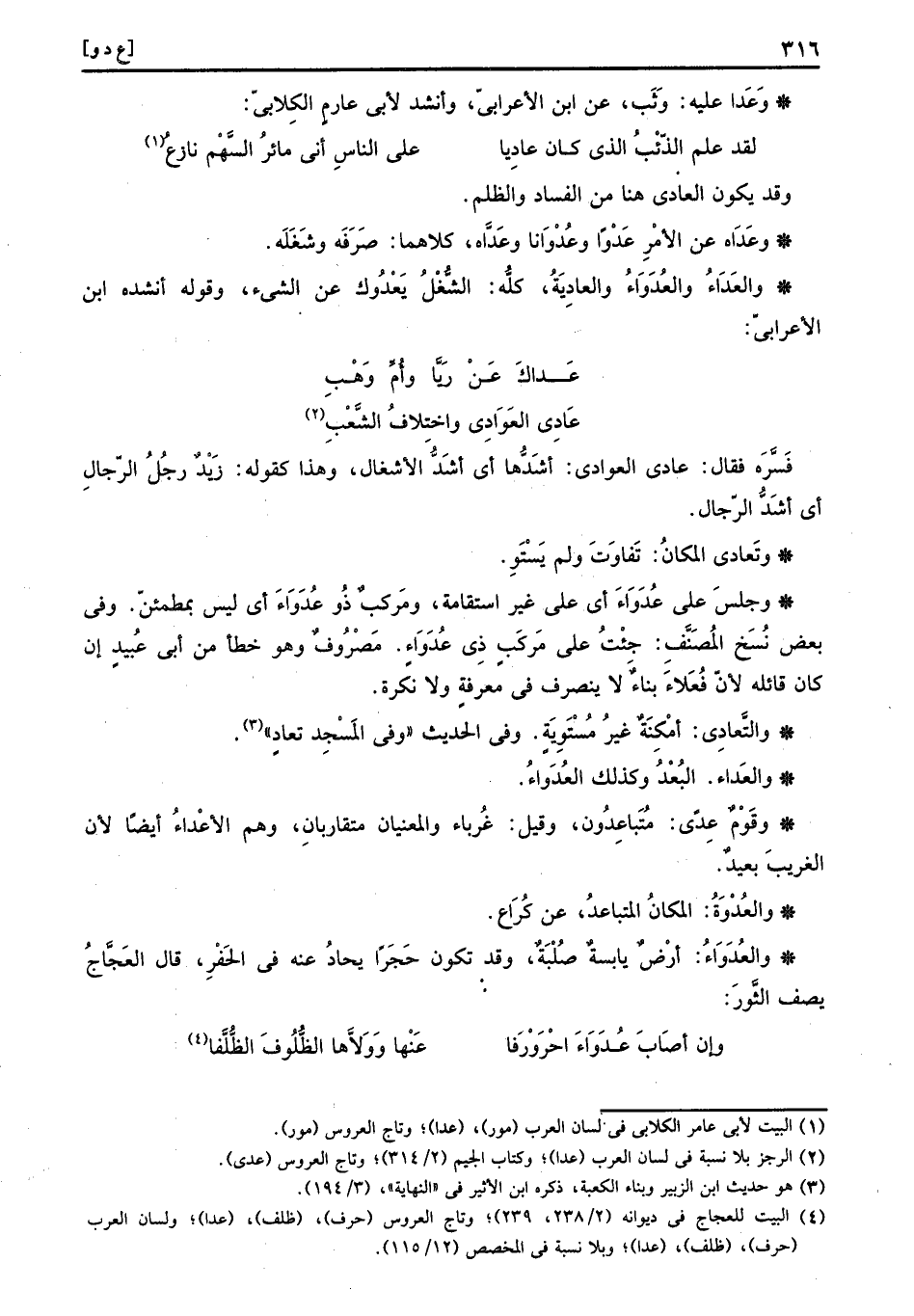 وَجلسَ على عُدَوَاءَ أَي على غير استقامة، ومركب ذُو عُدَوَاءَ أَي لَيْسَ بمطمئن. وَفِي بعض نسخ المُصَنّف: جِئْت على مركب ذِي عُدَوَاءٍ. مَصْرُوف وَهُوَ خطأ من أبي عبيد إِن كَانَ قَائِله لِأَن فُعَلاءَ بِنَاء لَا ينْصَرف فِي معرفَة وَلَا نكرَة.