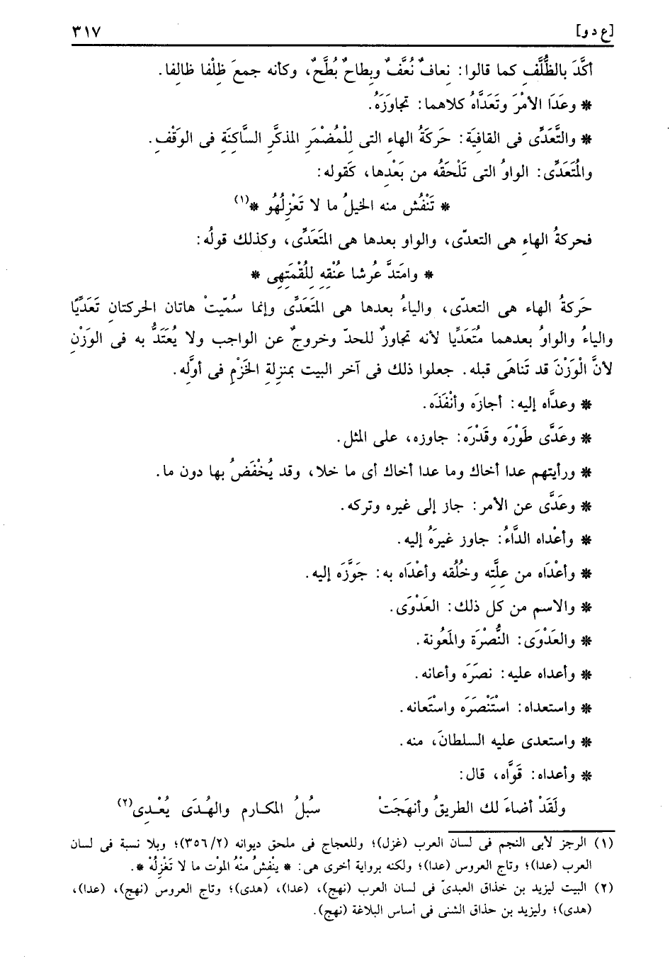 حَرَكَة الْهَاء هِيَ التَّعَدِّي، وَالْيَاء بعْدهَا هِيَ المتَعَدِّي، وَإِنَّمَا سميت هَاتَانِ الحركتان تعَدَيِّا وَالْيَاء وَالْوَاو بعدهمَا مُتَعَدّيا لِأَنَّهُ تجَاوز للحد وَخُرُوج عَن الْوَاجِب وَلَا يعْتد بِهِ فِي الْوَزْن لِأَن الْوَزْن قد تناهى قبله. جعلُوا ذَلِك فِي آخر الْبَيْت بِمَنْزِلَة الخزم فِي أَوله.